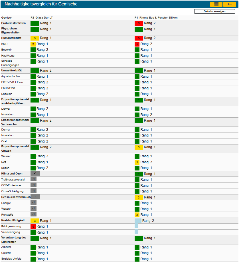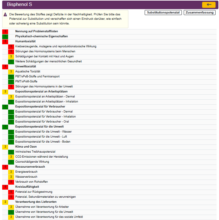 ChemSelect is not suitable for displaying minor differences in the sustainability of substances and mixtures. The assessment method and subdivision into just three categories (red/yellow/green) are too broad for this.