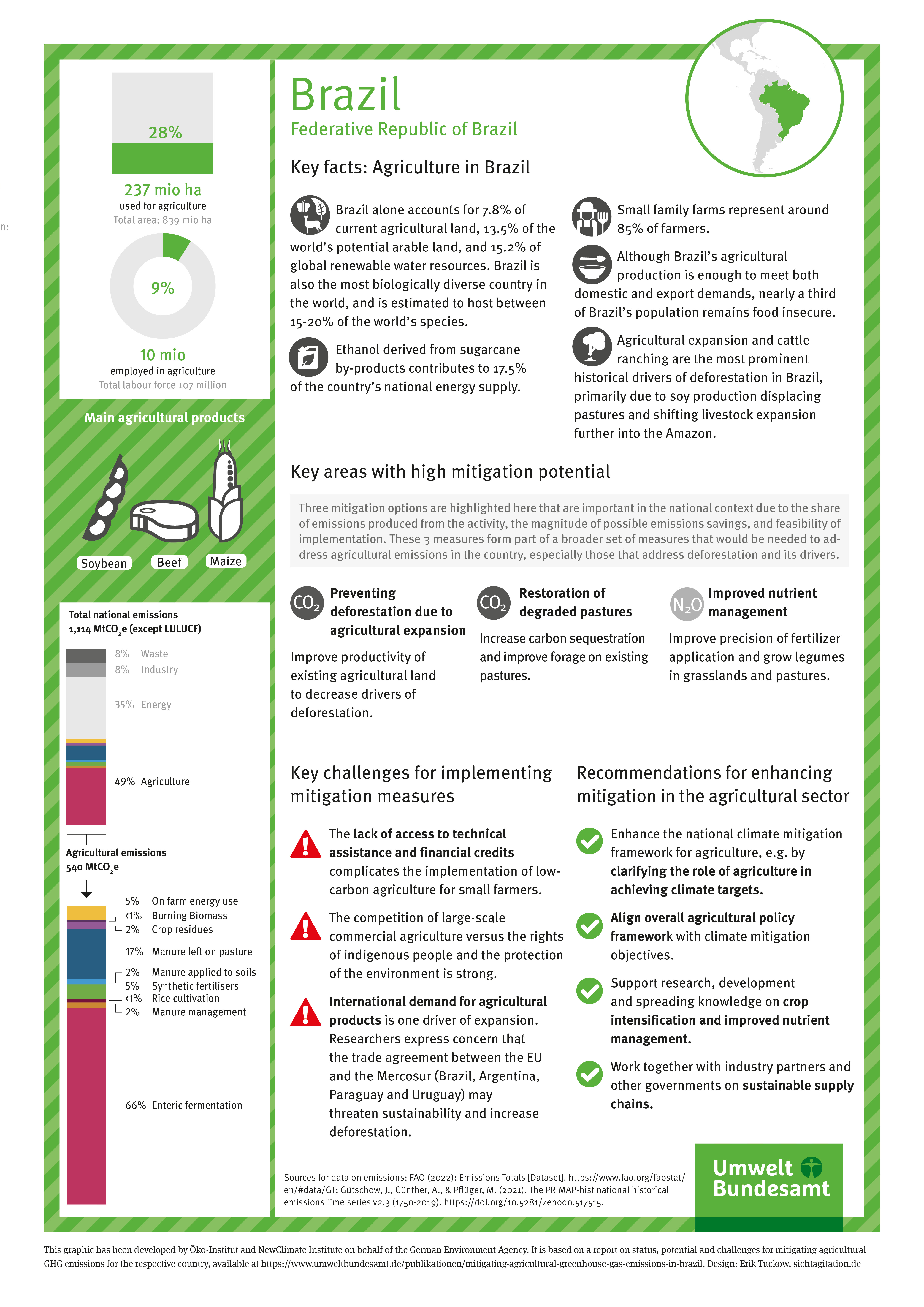Stopping agricultural expansion, which leads to deforestation, particularly in tropical countries (e.g. Brazil and Indonesia), offers the greatest potential for mitigation. However, reducing emissions from enteric fermentation also offers considerable mitigation potential, particularly through demand-side measures to reduce domestic consumption of animal products. Enteric fermentation is a key source of emissions in most countries, including emerging economies that are heavily dependent on animal product exports for their economies. While the reduction potential of certain agroecological practices such as cover crops and improved crop rotation is considered to be rather limited based on the literature, they nevertheless offer numerous additional benefits, for example by promoting adaptation to the effects of climate change. In addition, these are measures that can be implemented on a large scale without significant disadvantages or risks.