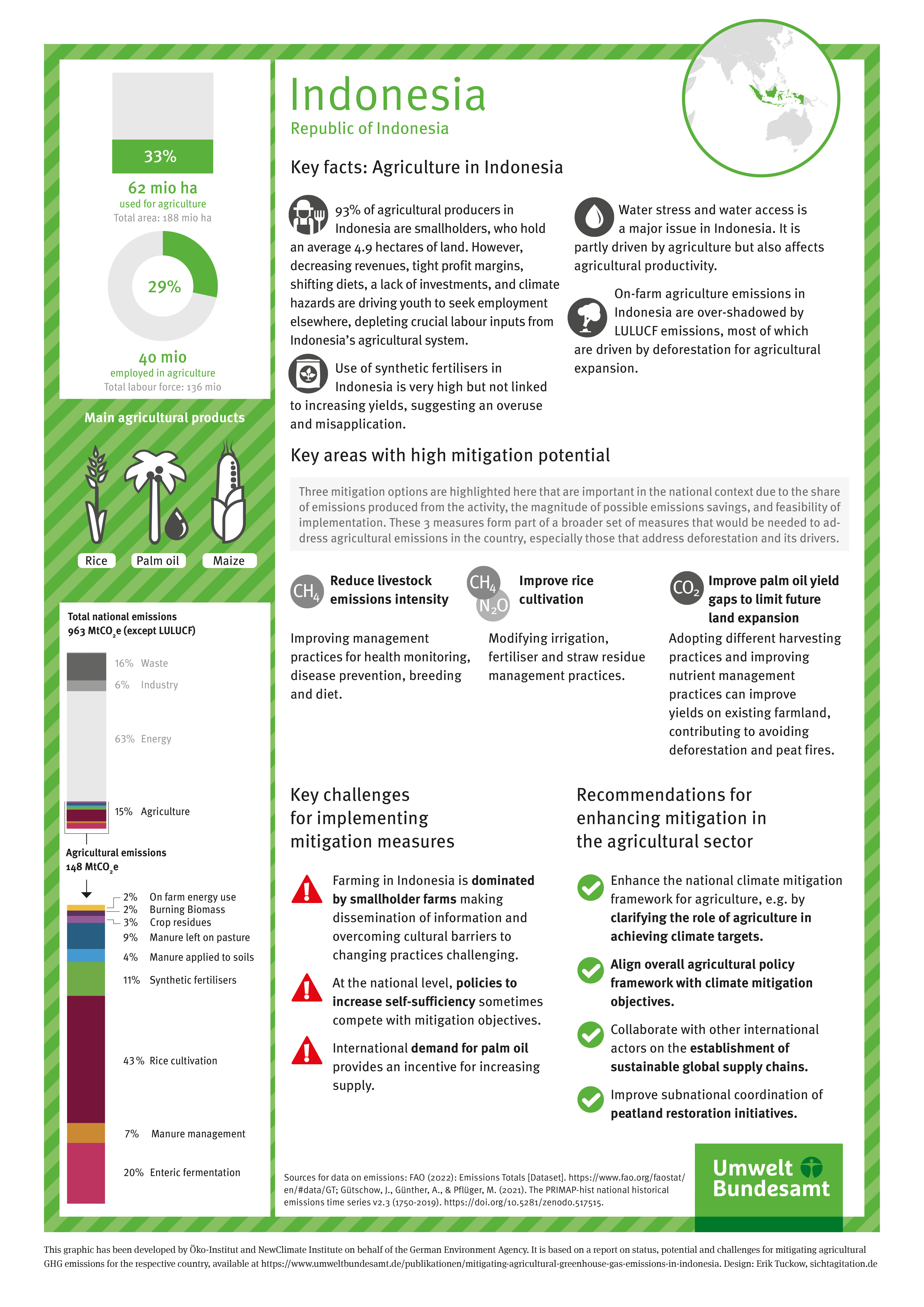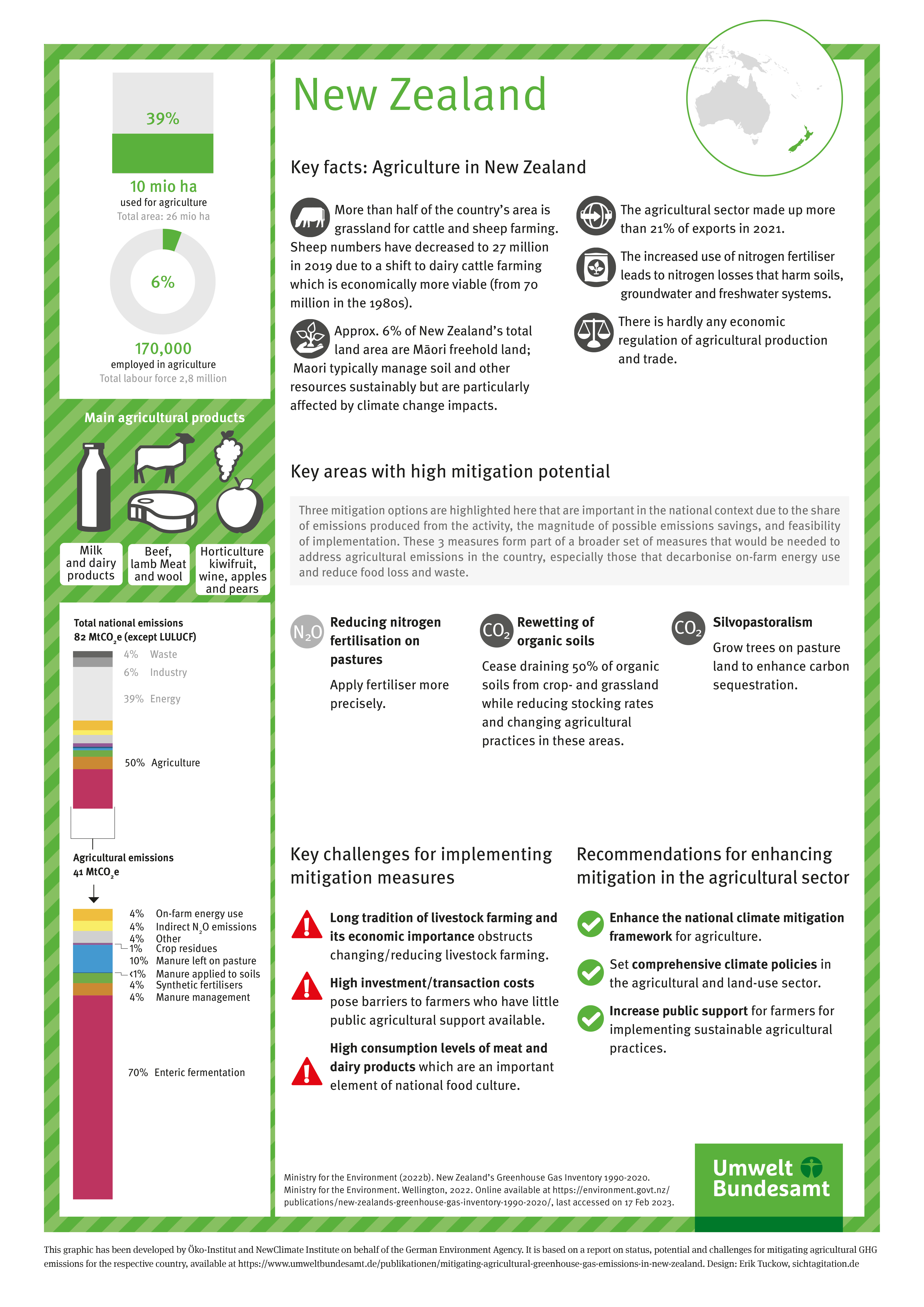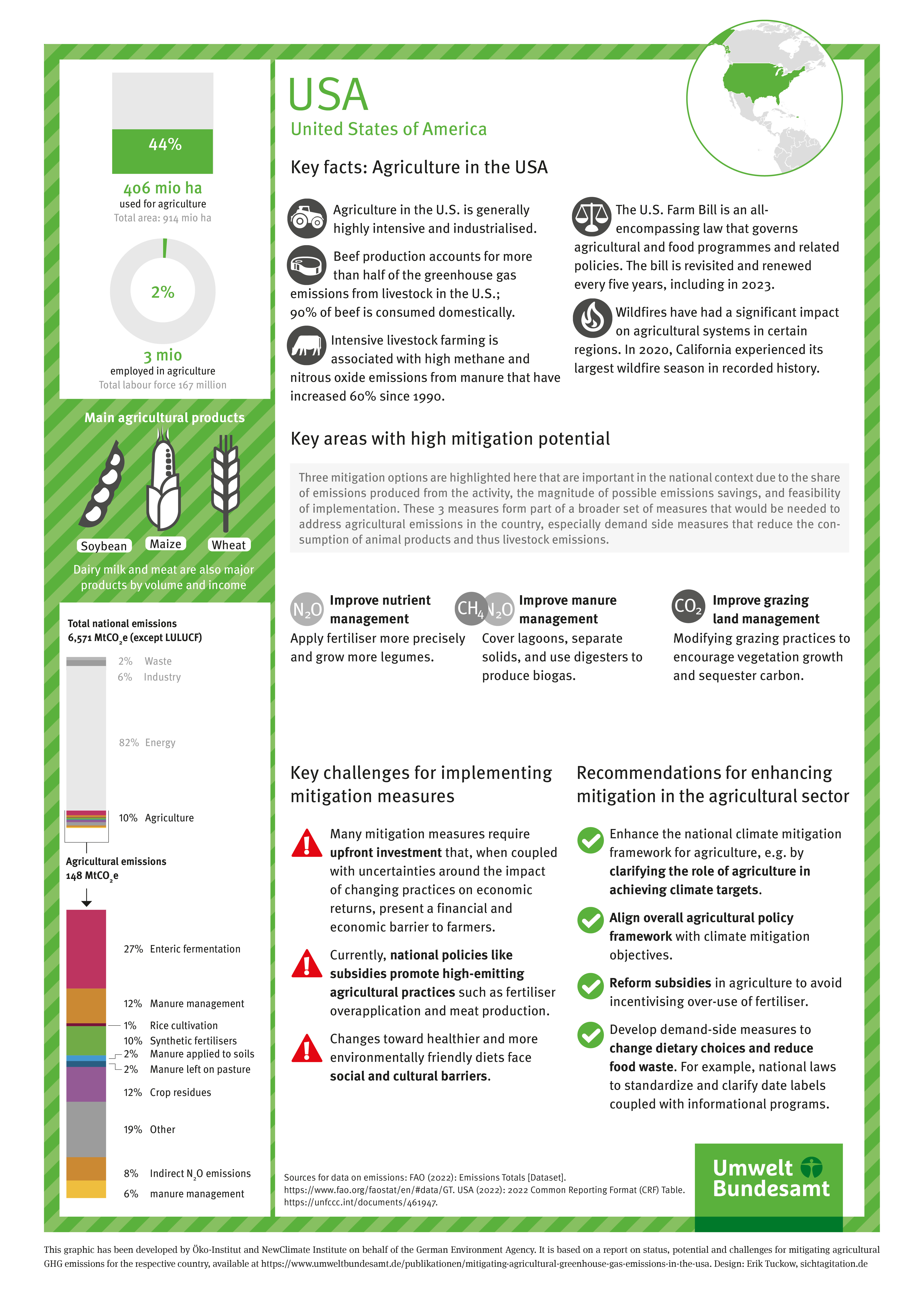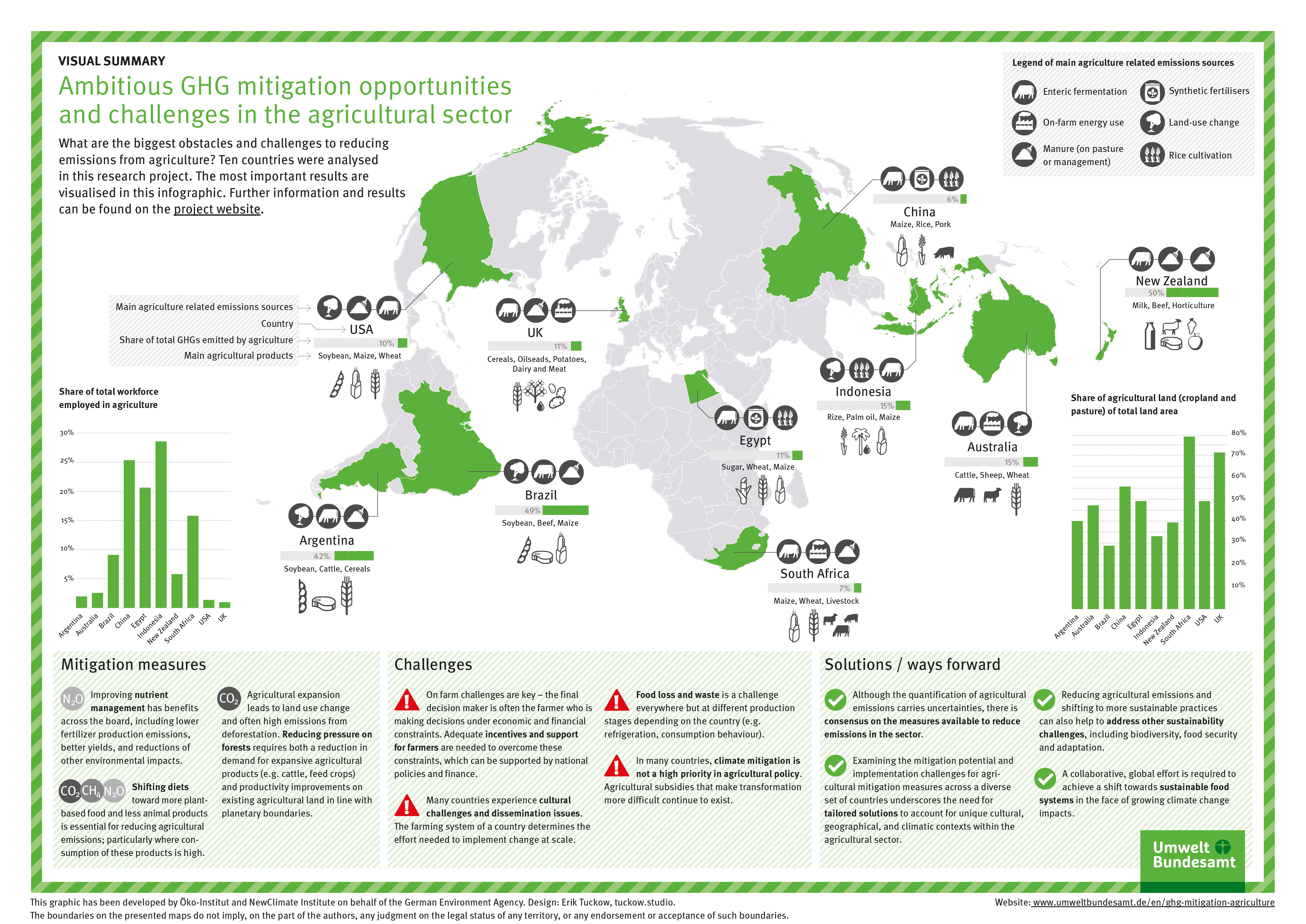 The natural, political, cultural and social conditions vary greatly depending on the region of the world. It therefore makes sense to take a closer look at individual countries on different continents. The potential for ambitious climate action in agriculture was analysed for Egypt, Argentina, Australia, Brazil, China, Great Britain, Indonesia, New Zealand, South Africa and the USA. In addition, selected mitigation measures were examined in depth and quantified, and obstacles and barriers to the implementation of the mitigation options were identified.
