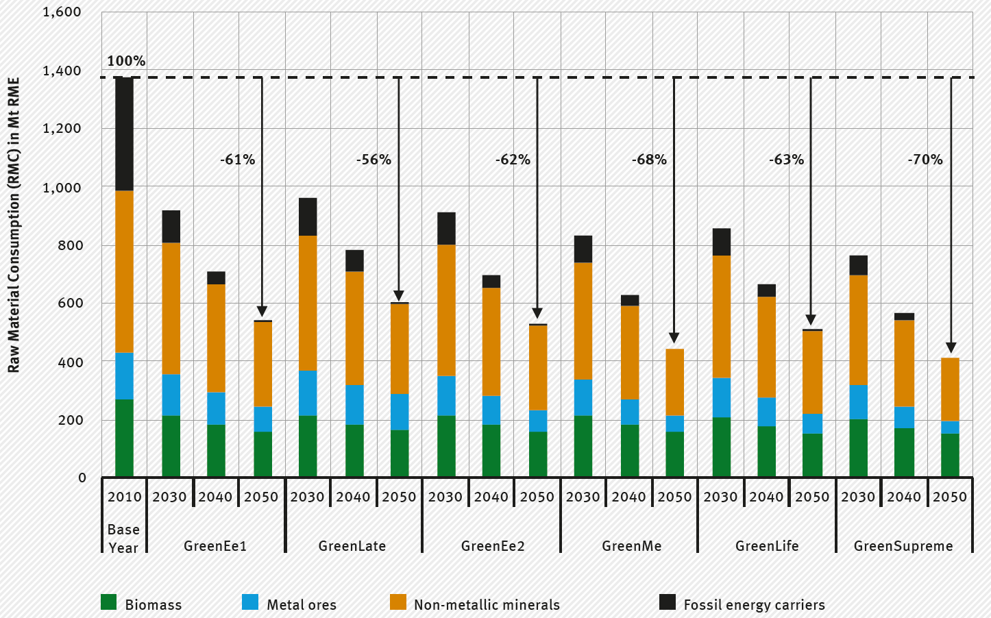 In all Green scenarios, the greatest reduction in raw material requirements is associated with the phase-out of fossil fuels (Figure 2). In GreenLate, this leads to a 56 percent reduction in the RMC by 2050 compared to 2010. In the two GreenEe scenarios, with a focus on energy efficiency and supplemented by other aspects of sustainable lifestyles, a reduction of around 61 to 62 percent by 2050 is observed. Additional measures to increase material efficiency (GreenMe) have the potential to reduce material consumption by a total of 68 percent. Further lifestyle changes, such as, e.g., space-efficient construction or the increased use of durable and repairable products, results in a 63 percent reduction in GreenLife compared to 2010. The combination of these measured combined with a faster implementation in GreenSupreme allows for a reduction of 70 percent in RMC by 2050.