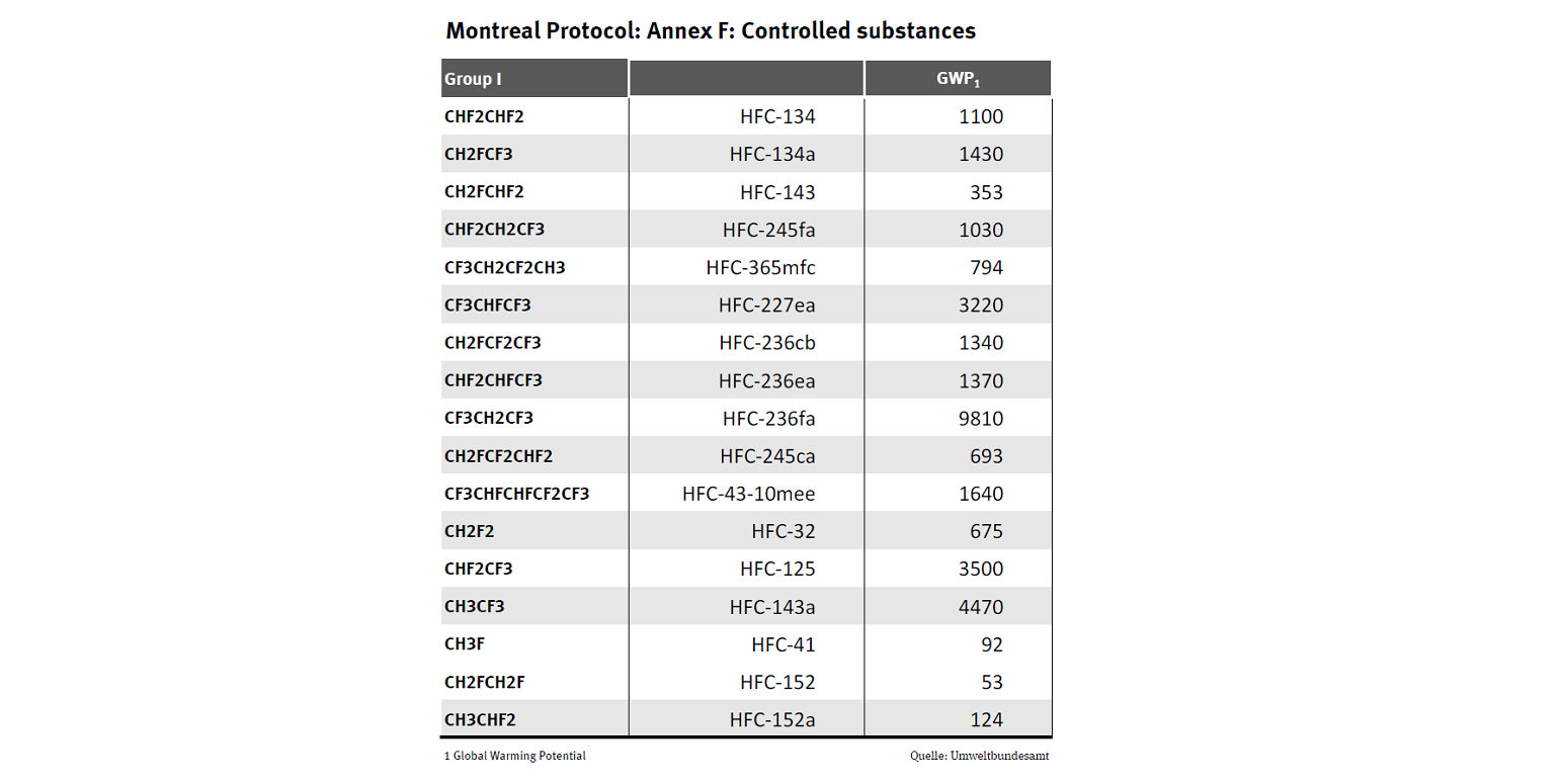 The effects of climate change can be observed in virtually every corner of the globe nowadays. Hence climate protection is one of the most serious ecological and economic challenges now facing the human race. The Kyoto Protocol, which is the most important and most prominent climate milestone to date, covers fluorinated greenhouse gases (F-gases) owing to their high global warming potential (GWP). The Global Warming Potential (GWP) is a measure of the climate effectiveness of greenhouse gases compared to CO2 as a reference substance (GWP = 1) and is usually considered over a period of 100 years. In the context of the Framework Convention on Climate Change, the international community has agreed to use the GWP values of the IPCC 's Fifth Assessment Report. The GWP values of F-gases are up to 23,500 times higher than those of CO2.