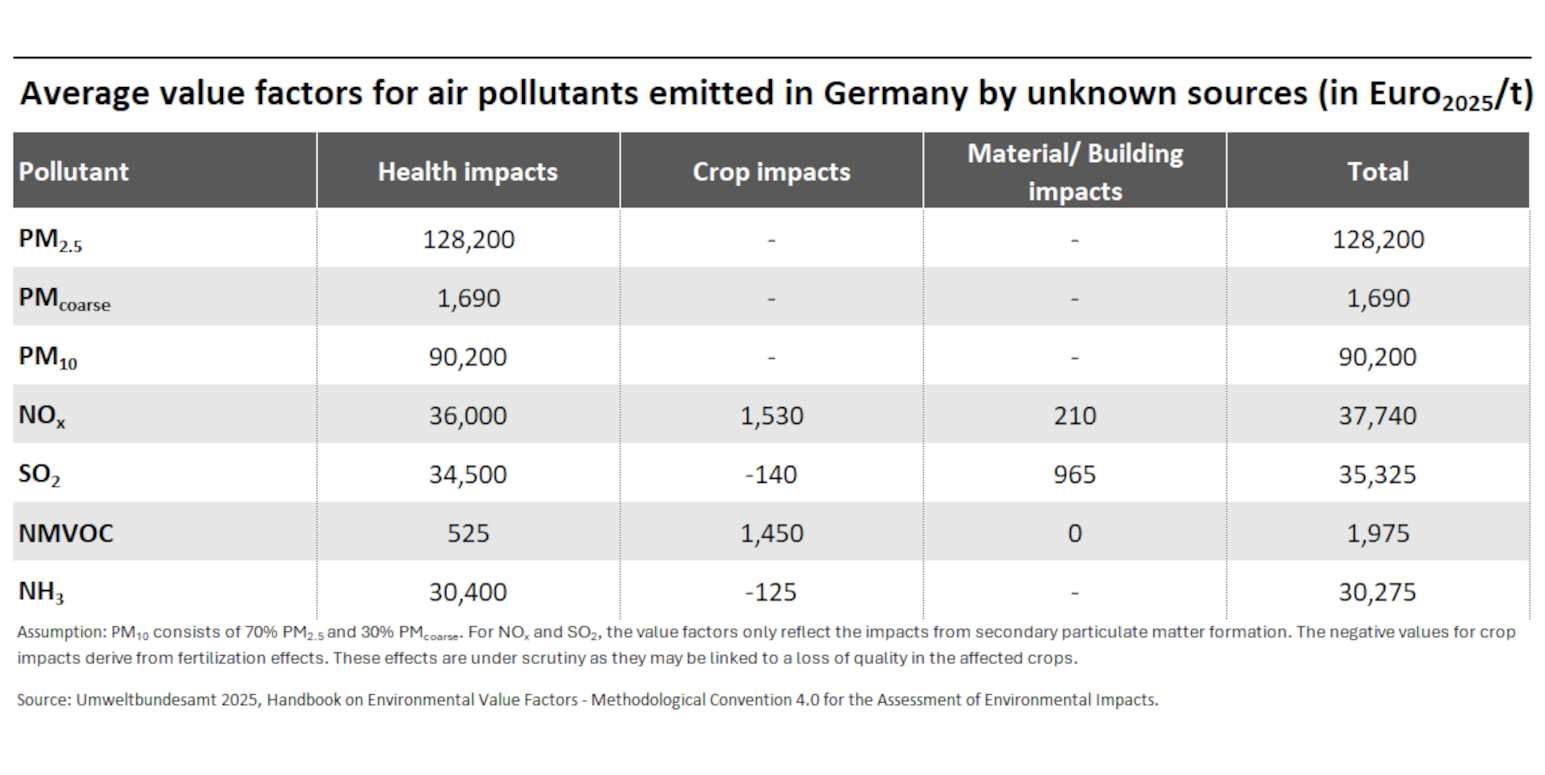 Air pollutants also affect ecosystems and biodiversity. However, due to the difficulties in assessing biodiversity impacts, the current value factors do not incorporate these effects. Hence, they should be interpreted as rather conservative estimates of the actual impacts of air pollution.