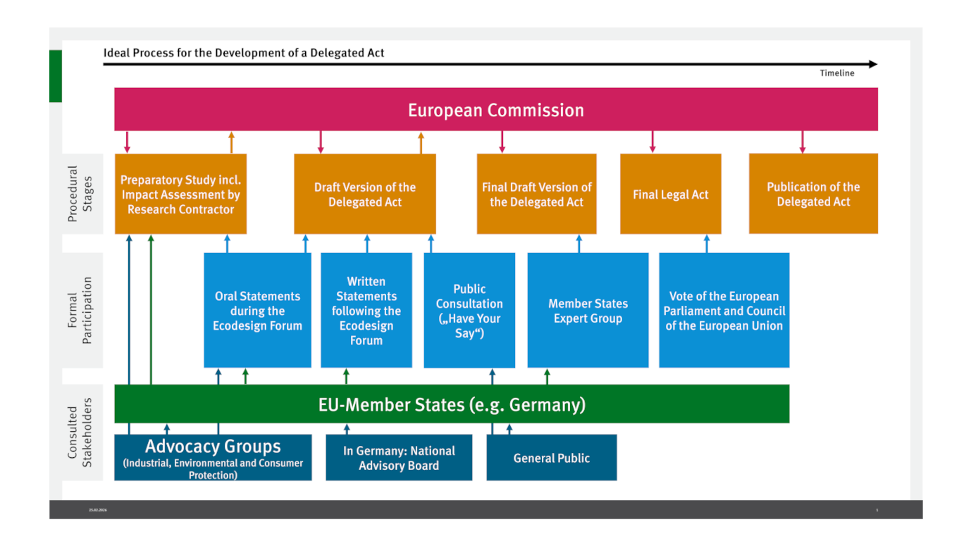 Public procurement: The regulation enables the introduction of binding environmental criteria in public procurement procedures—for example, in the form of minimum technical standards, performance criteria, or performance targets. Delegated acts will determine which requirements apply to specific product groups. In the future, public authorities will be required to prioritise sustainable and resource-efficient products that are consistent with the principles of the circular economy.