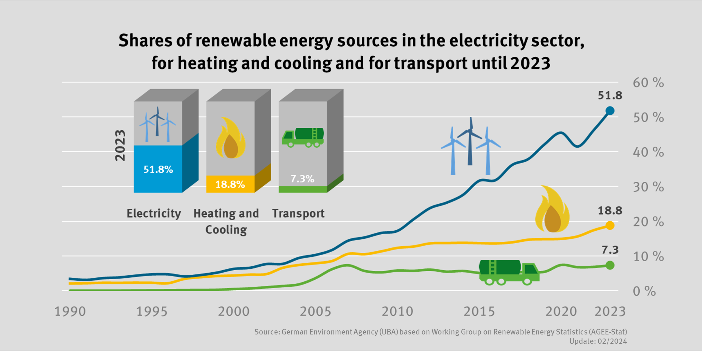 In 2023, renewable energy share rose to 51.8% in the electricity sector, 18.8% in the heating sector and 7.3% in the transport sector. The share of renewable energies in the electricity, heating and transport sectors rose again in 2023