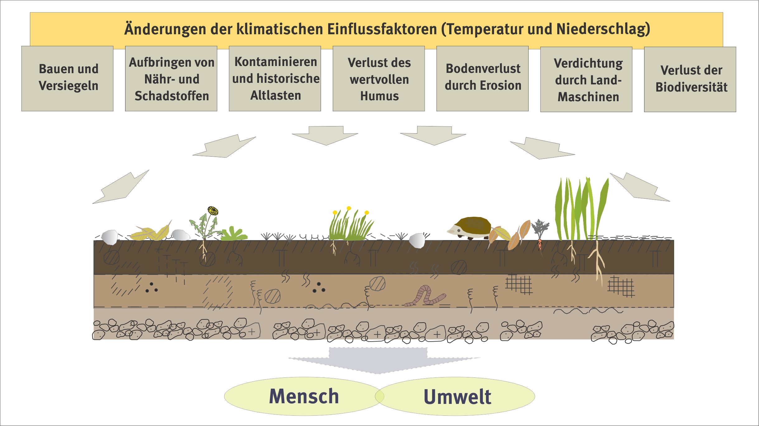 It’s no exaggeration to say that Germany’s land undergoes all manner of abuse on a daily basis, ranging from contaminant and nutrient inputs to road and housing construction and erosion. Moreover, climate change has a devastating effect on soil ecology, which can also be degraded by intensive farming.