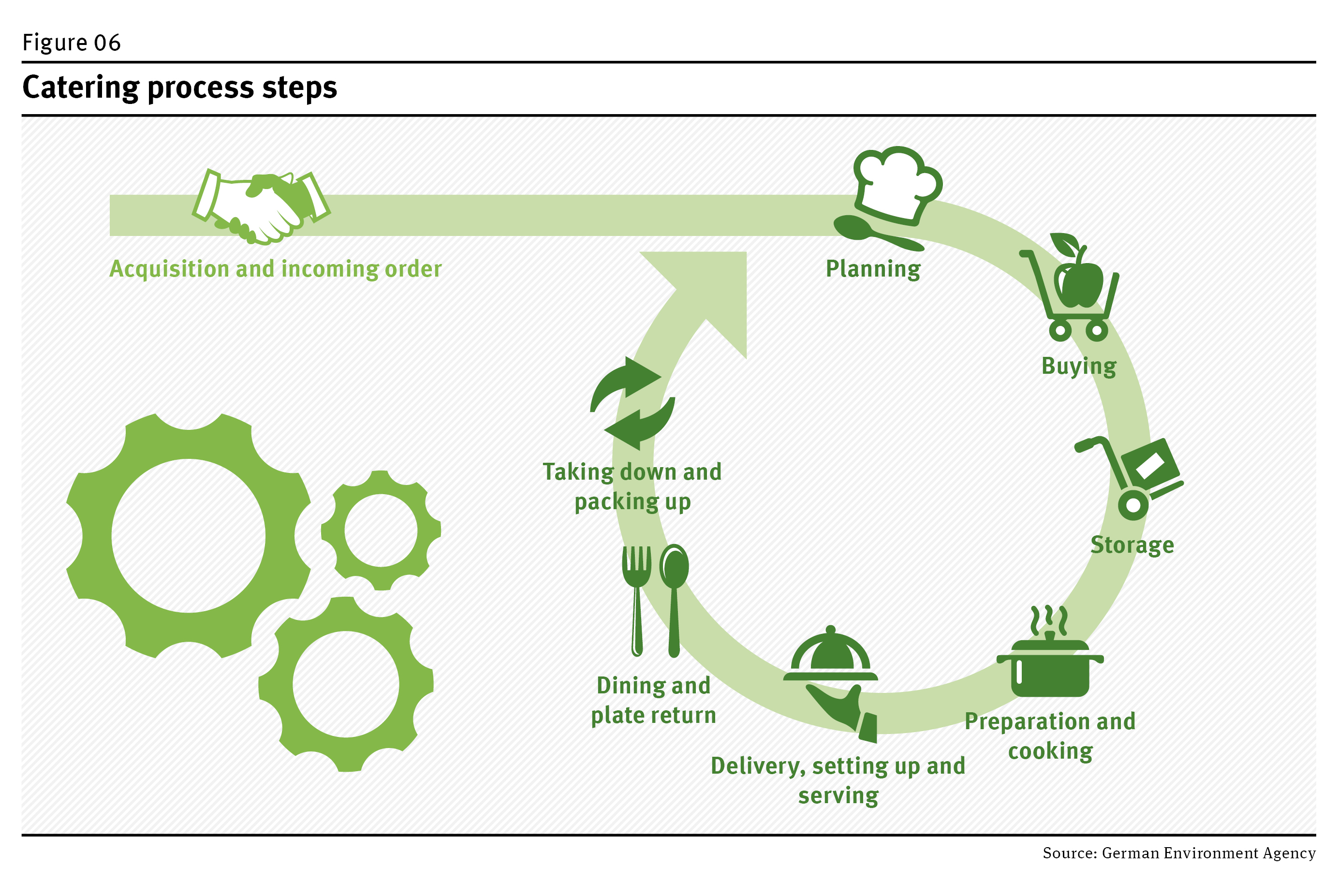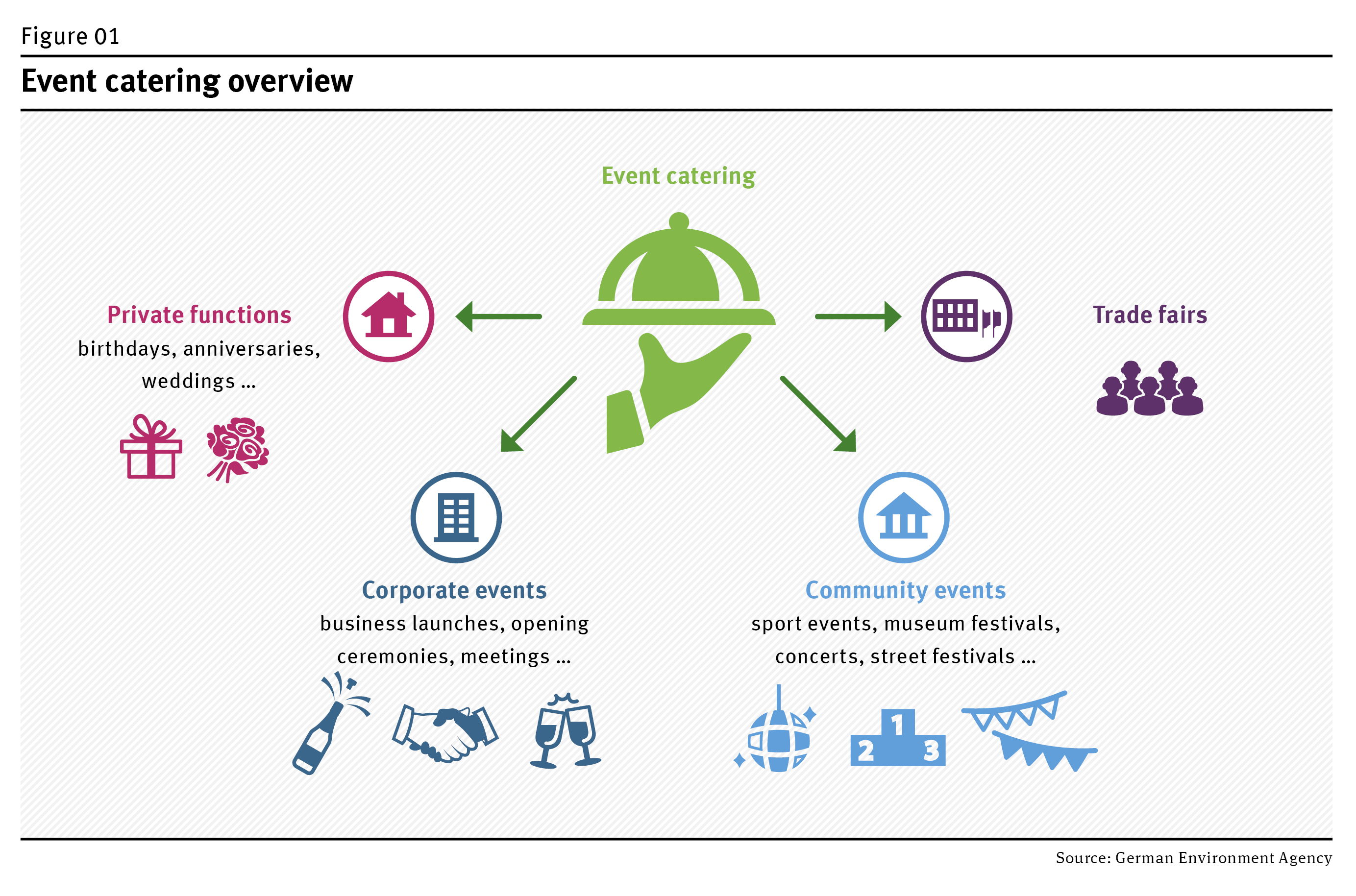 The focus of the UBA Guideline "Prevention of food waste in the catering sector" is on the professional event catering sector which is behind public events such as city festivals, exhibition openings, sports events, music festivals and fairs, private gatherings such as family get-togethers, or corporate functions like business start-ups, company anniversaries, branch office openings and meetings.