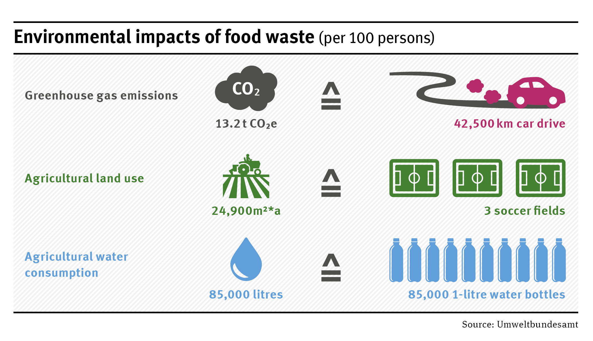100 Personen verursachen durch Lebensmittelabfälle 13,2 Tonnen CO2e Treibhausgasemissionen. Excessive food production is an unnecessary environmental burden.