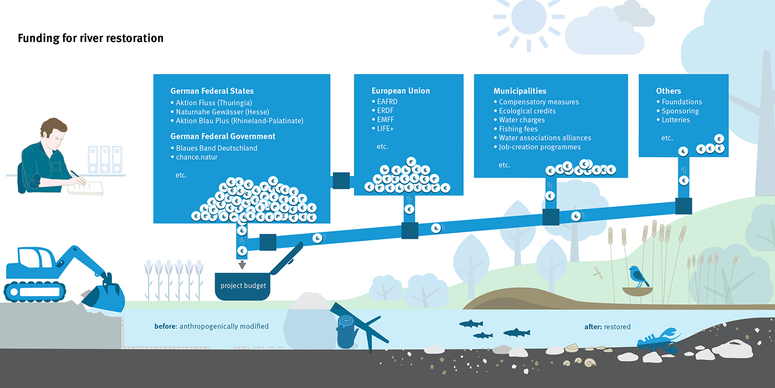 Depending on the type of restoration project, the costs can be very high. Therefore, the German federal states and the European Union offer numerous funding and financing programmes. In addition, river restoration projects can be used as compensatory measures in the context of impact regulation under nature protection law. Foundations and sponsors can also be considered. With a clever combination of several financing instruments, restoration projects can be financed up to 100 %.