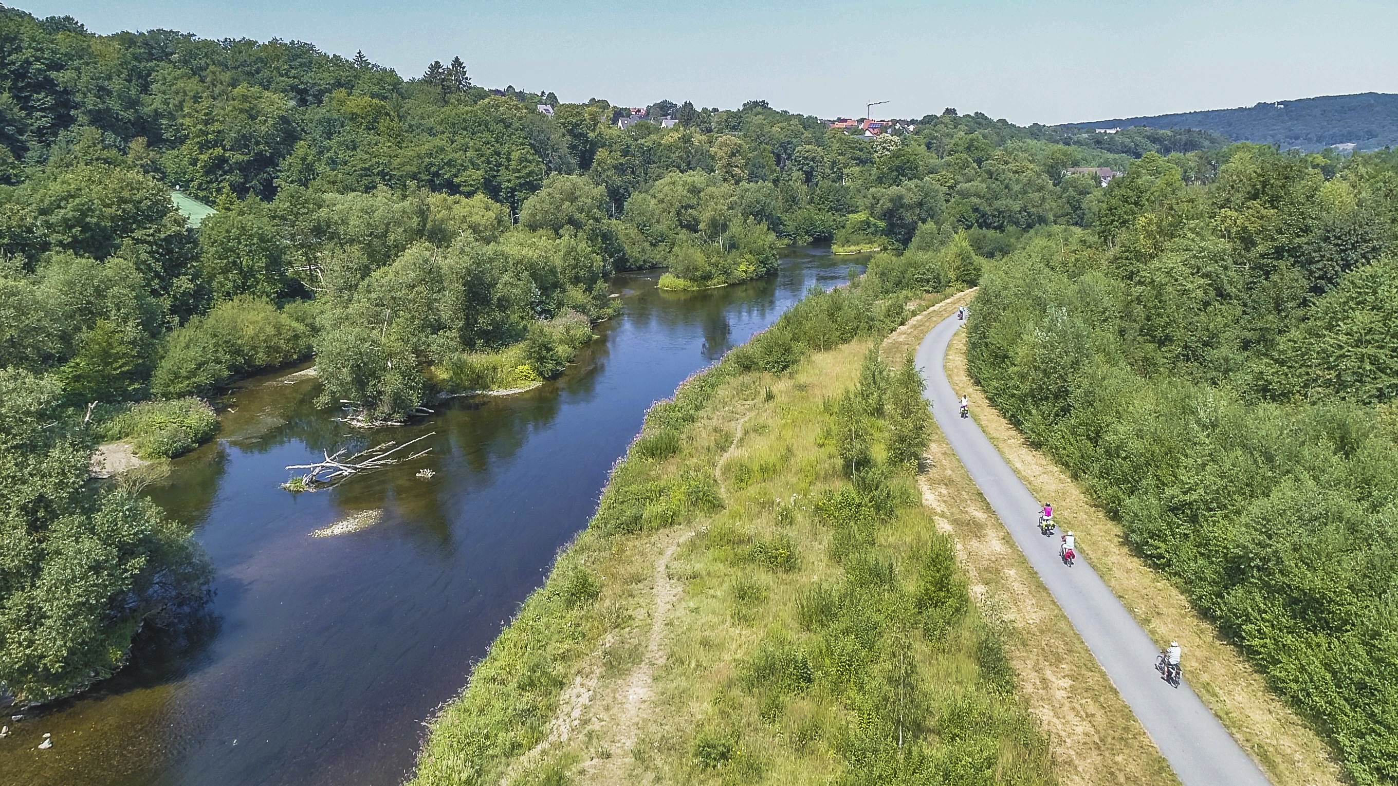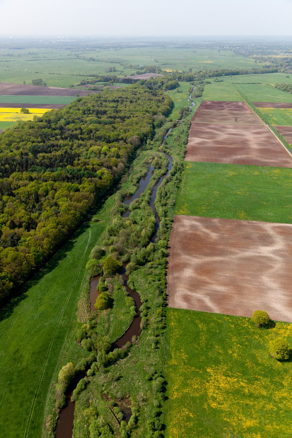Aerial view of the Fulda and a branch with low water flow. Grasses, shrubs and trees grow on the banks with diverse hydromorphological structures.