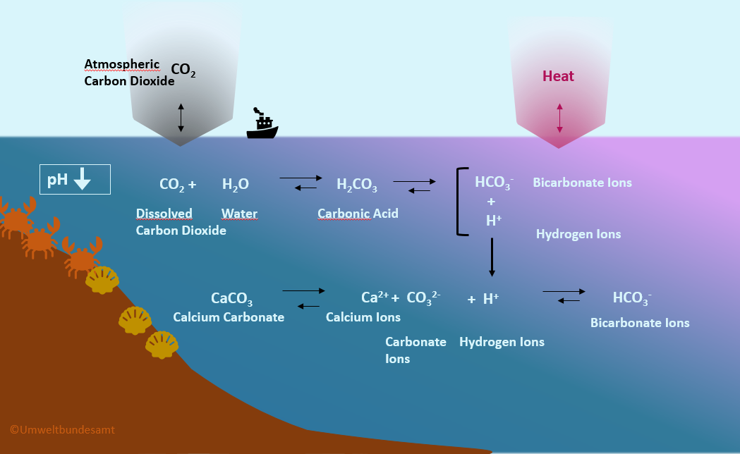 The highly simplified illustration shows the chemical equilibrium reaction of CO₂ with the formation of carbonic acid from the reaction of CO₂ with water and carbonate ions in the sea. Acidification process in the sea