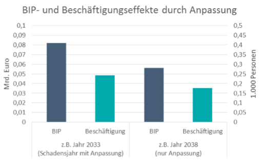 Sowohl in Schadensjahren (z.B. Jahr 2033, links) als auch in Nicht-Schadensjahren (z.B. Jahr 2038, rechts) kommt es durch die Umsetzung der Anpassungsmaßnahme im Vergleich zu einem Szenario ohne Anpassung zu einem positiven BIP-Effekt. In Schadensjahren ist dieser positive BIP-Effekt zum einen durch die jährlichen Investitionen und zum anderen durch die Reduktion des Produktionsausfalls zu erklären. Leichte Preissteigerungen sorgen für eine leichte Abschwächung des Effekts im Zeitablauf. Auch die Beschäftigung profitiert leicht durch Anpassung.