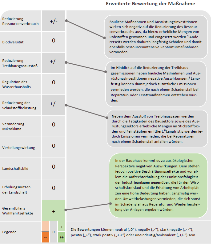 ( +/- ) Reduzierung des Treibhausgasausstoßes Im Hinblick auf die Reduzierung der Treibhausgasemissionen haben bauliche Maßnahmen und Ausrüstungsinvestitionen negative Auswirkungen. Langfristig können damit jedoch zusätzliche Emissionen vermieden werden, die nach einem Schadensfall bei Reparatur- oder Ersatzmaßnahmen entstehen würden.
