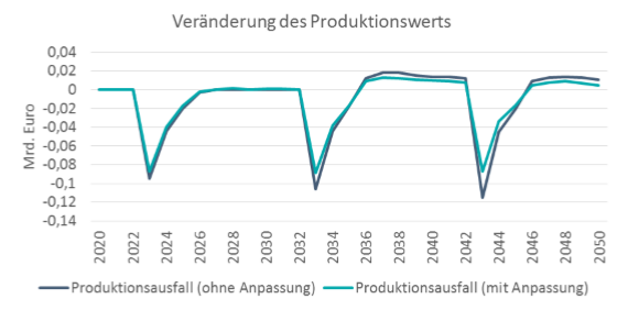 Für die Modellrechnung wird angenommen, dass für die Erhöhung der Anlagensicherheit jährlich 100 Mio. € investiert werden, die sich wie folgt aufteilen: 30% der Investitionen gehen in bauliche Veränderungen im Sektor Maschinenbau, 70 % der Investitionen werden vom Sektor Maschinenbau für DV-Geräte und Elektrische Ausrüstungen ausgegeben. Diese zusätzliche Nachfrage sorgt für eine Produktionssteigerung in den genannten Sektoren. Die verbesserte Anlagensicherheit sorgt dafür, dass in Jahren mit Sturmereignis der Produktionsausfall in der Industrie geringer ausfällt, da die Anlagen durch die Anpassungsmaßnahme weniger anfällig für Sturmschäden sind. Die Abbildung verdeutlicht, dass die Schäden durch Produktionsausfall z.B. im Sturmjahr 2043 um etwa ein Viertel geringer ausfallen. Sowohl die Investitionen als auch die Reaktionen im Modell fallen jedoch in ihrer Höhe nur gering aus.