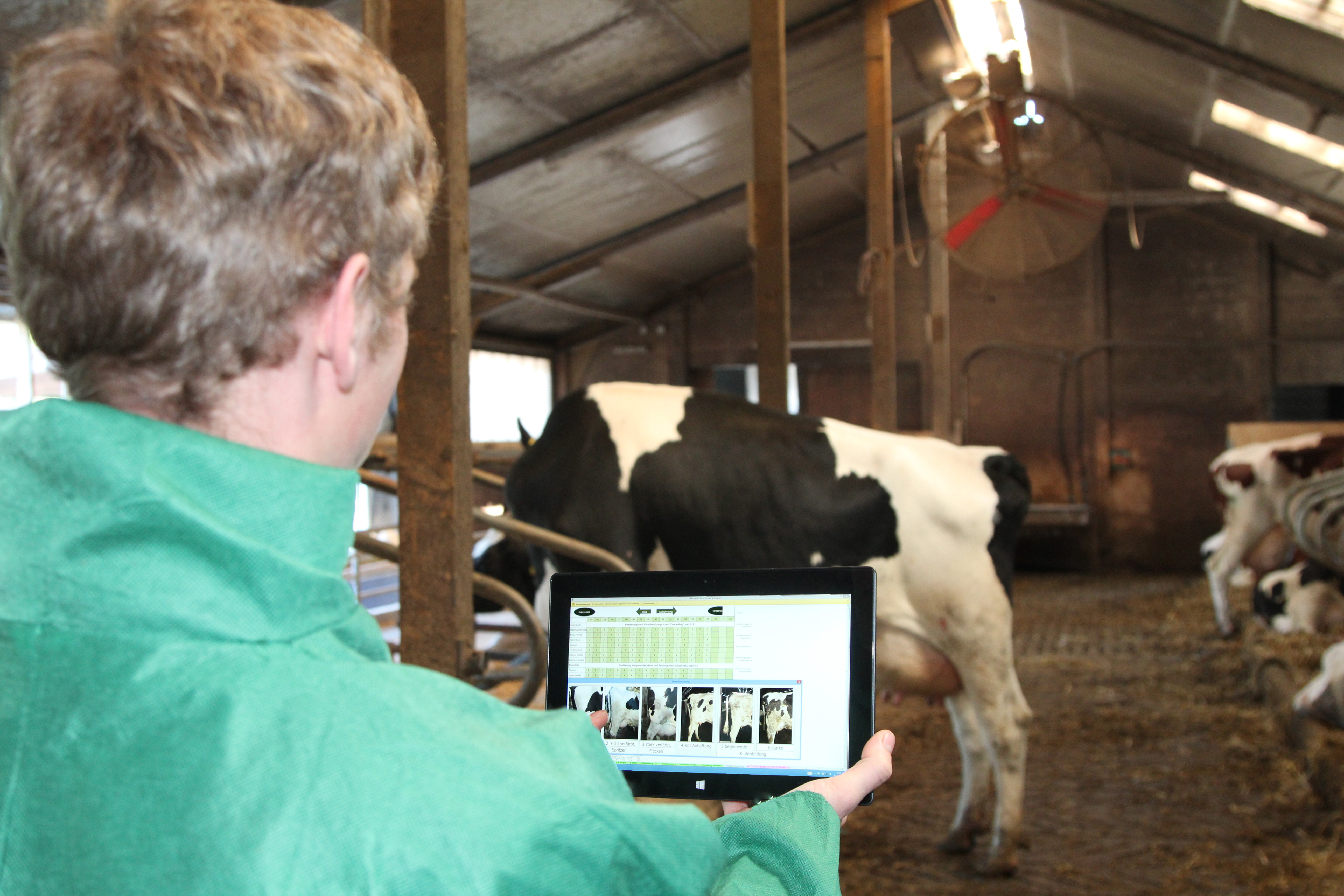 Foto: Person im Kuhstall mit einem Tablet auf dem Diagramme angezeigt werden. Erhebung und Dokumentation von Daten im Stall