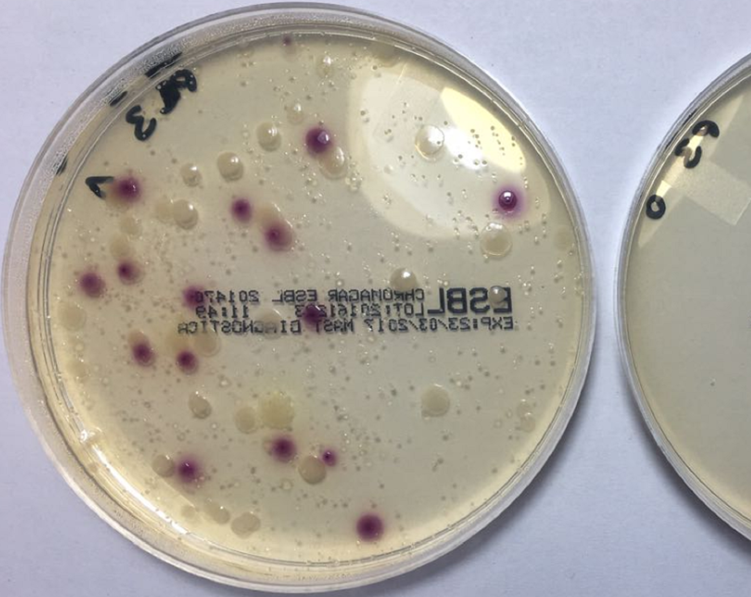Foto: Spezielle Agarplatte mit positivem Nachweis von Extended-Spectrum Beta-Lactamase-Bildner. Positiver Nachweis von antibiotikaresistenten Keimen