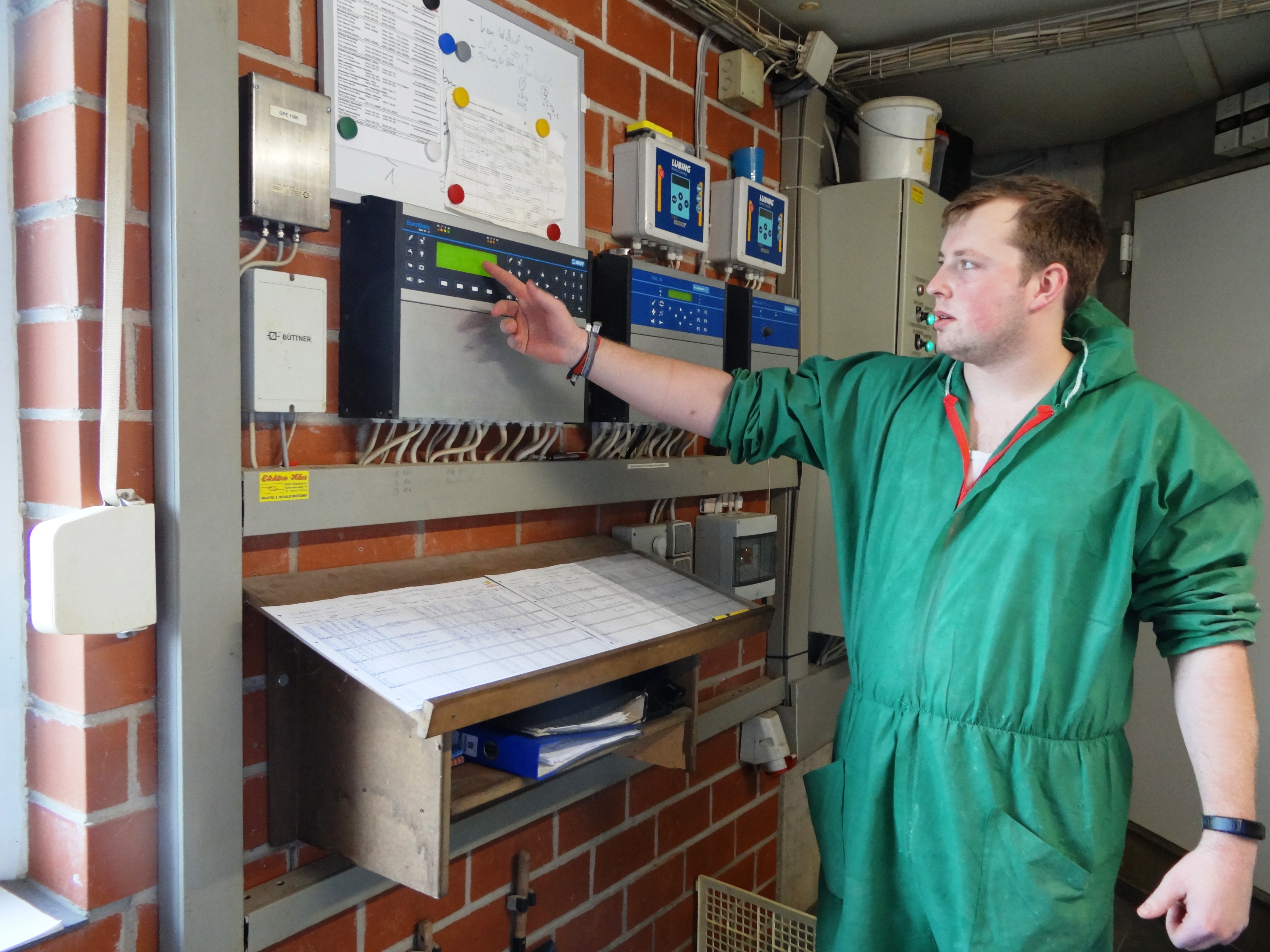 Landwirt in Schutzkleidung vor Anzeigetafel eines digitalen Monitoringsystems.