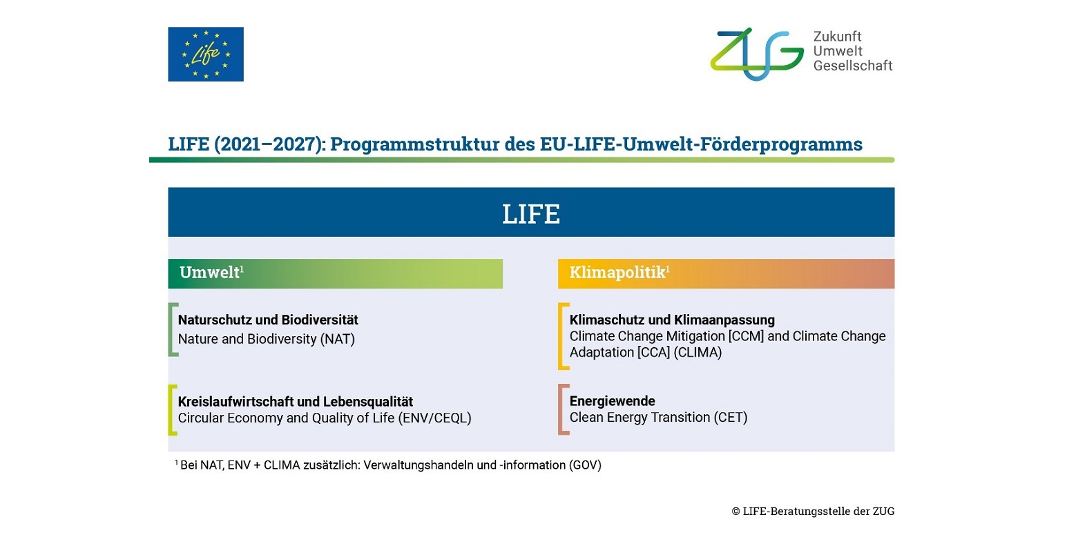 Das LIFE-Programm („L’Instrument Financier pour l’Environnement“) ist das Förderinstrument der Europäischen Union für Umwelt- und Klimaschutz. Bis heute ist es das einzige EU-Programm, das sich ausschließlich diesem Zweck widmet und das Akteur*innen vor Ort bei wegweisenden Maßnahmen unterstützt, die dazu beitragen sollen, die Umwelt- und Klimaziele der Europäischen Union zu erreichen. So leistet LIFE einen wichtigen Beitrag, um den European Green Deal und den Clean Industrial Deal umzusetzen.