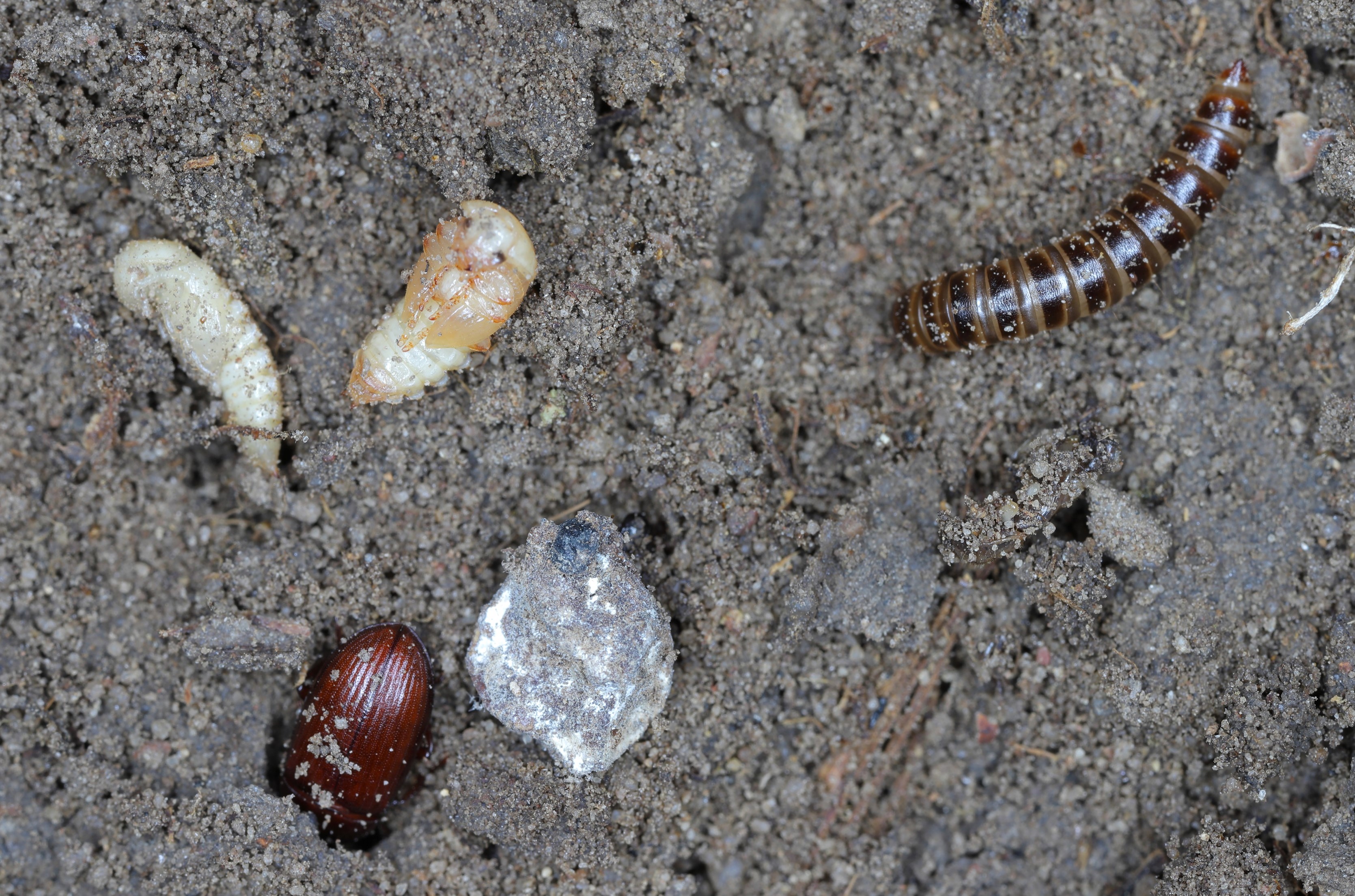 Entwicklungsstadien des Getreideschimmelkäfer, zu sehen sind der erwachsene Käfer, Larve und Puppe Entwicklungsstadien des Getreideschimmelkäfer