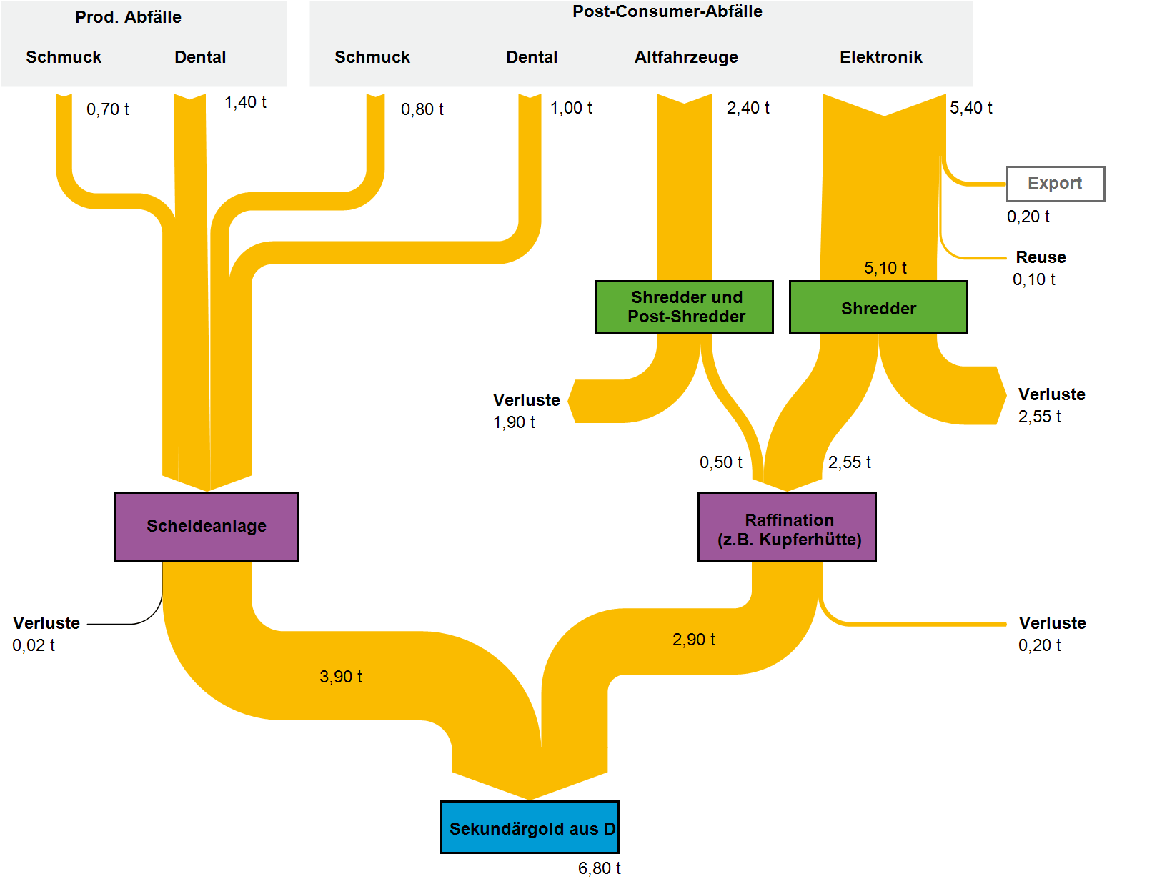 Goldhaltige Schrotte aus Elektroaltgeräten sowie Altautos werden aufbereitet und gelangen in die Kupferraffination, wo Gold genauso wie Silber und weitere Edelmetalle elektrolytisch aufkonzentriert und abgeschieden wird.