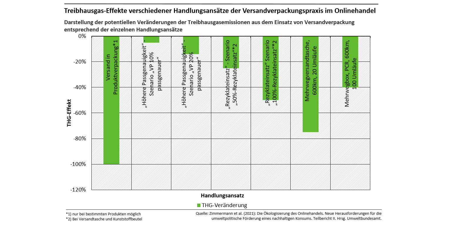 Mit zunehmendem Wachstum des Onlinehandels wird auch mehr und mehr über dessen Umweltwirkungen diskutiert. Für die Umwelt besonders relevant sind die in den Onlineshops angebotene Produktpalette, die letzte Meile gefolgt von den sonstigen Transporten und der Versandverpackung, mit leichten Unterschieden je nach konkretem Fall. Das Forschungsvorhaben „Ökologisierung des Onlinehandels - Neue Herausforderungen für die umweltpolitische Förderung eines nachhaltigen Konsums“ hat dabei Optimierungspotentiale identifiziert, die in diesem Leitfaden präsentiert werden. So sind zum Beispiel auf der letzten Meile und bei Verpackungen klimarelevante Einsparpotentiale von bis zu 80 Prozent und mehr möglich, was die Abbildungen unten zusammenfassen. Eine umfassendere Darstellung und Bewertung der Umweltwirkungen des Onlinehandels findet sich in den Teilberichten I und II des genannten Vorhabens, welches vom Institut für Ökologie und Politik GmbH (Ökopol) durchgeführt und 2020 sowie 2021 veröffentlicht wurden.