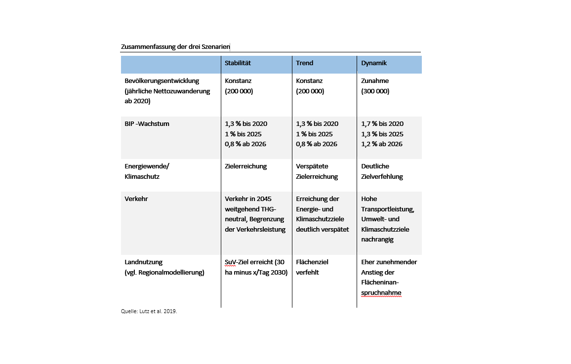 Darauf aufbauend analysierte das Autorenteam die internationalen Shared Socio-economic Pathways (SSPs), die auf fünf Narrativen für sehr unterschiedliche sozioökonomische Entwicklungen basieren (vgl. Kriegler et al. 2012). Die SSPs wurden hinsichtlich ihrer Bedeutung für die narrativen Szenarien für Deutschland betrachtet: Für ein Trendszenario eignet sich SSP 2 („Middle of the road“) als Basis, bei dem die gegenwärtigen Entwicklungen fortgeschrieben werden. SSP 1 („Taking the green road“) bietet sich als Ausgangspunkt für ein Nachhaltigkeitsszenario an. Ein drittes Szenario soll eine dynamische sozioökonomische Entwicklung abbilden. Am ähnlichsten ist hierfür das SSP 5 („Taking the highway“) hinsichtlich der Entwicklung von Technologie und Wirtschaftsleistung. Das Szenario muss aber angepasst werden, weil es die Nutzung fossiler Energieträger betont, die für Deutschland aufgrund der Energiewende unrealistisch erscheint.