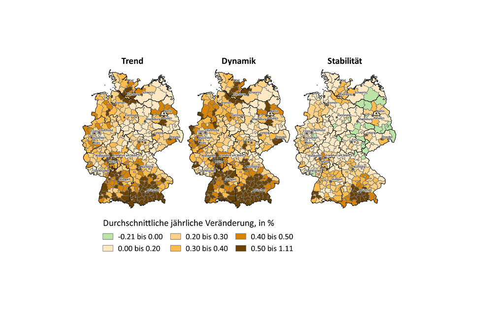 Als Grundlage untersuchte das Forschungsteam Megatrends (vgl. OECD 2016) auf globaler und nationaler Ebene. Dadurch konnten Kenngrößen abgeleitet werden, mit denen zukünftige gesellschaftliche, politische und wirtschaftliche Entwicklungen in Deutschland charakterisiert werden können. Die Betrachtung der Megatrends zeigt, dass sich langfristige Trends unterschiedlich gut quantifizieren lassen. Bevölkerungsentwicklung, Urbanisierung und das damit zusammenhängende Wirtschaftswachstum lassen sich relativ leicht vorhersagen. Entwicklungen hingegen, die von politischen Entscheidungen wie der Umsetzung des Pariser Abkommens oder von technischen Innovationen wie der Digitalisierung abhängig sind, sind schwer vorhersehbar.
