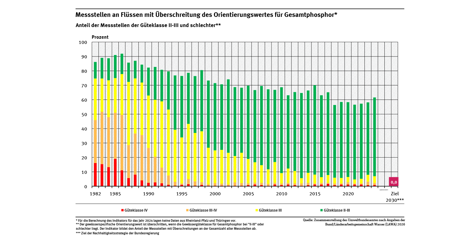 Anfang der 1980er Jahre wurden an fast 90 % aller Messstellen überhöhte Phosphorgehalte gemessen. Seit 2018 liegt der Anteil bei knapp 60 %. Innerhalb der unterschiedlichen Güteklassen sind deutliche Verbesserungen erkennbar: Insgesamt ist der Anteil der stärker belasteten Gewässer zurückgegangen. Zu dieser Verbesserung haben vor allem die Einführung phosphatfreier Waschmittel und der Ausbau der dritten Reinigungsstufe mit der Phosphatfällung in den größeren Kläranlagen seit den 1990er Jahren beigetragen.