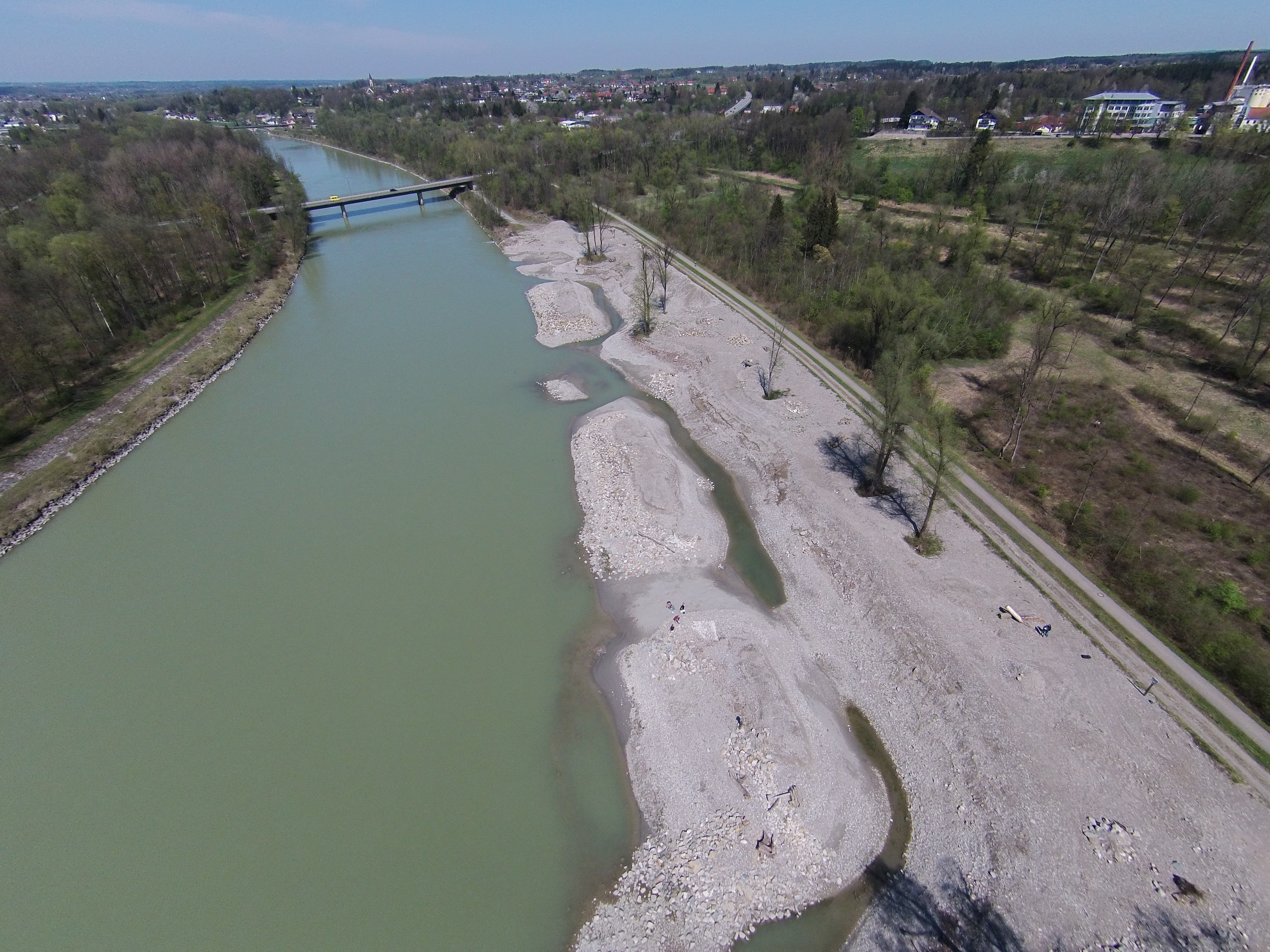 - Im Bereich des Wasserkraftwerks Rosenheim wurde der Uferverbau entfernt und "weiche" Ufer geschaffen. Durch eigendynamische Prozesse wie Erosion und Verlandung bilden sich Flachwasserzonen mit geringer Strömung aus. Diese Bereiche sind besonders für Jungfische als Lebensraum wichtig.