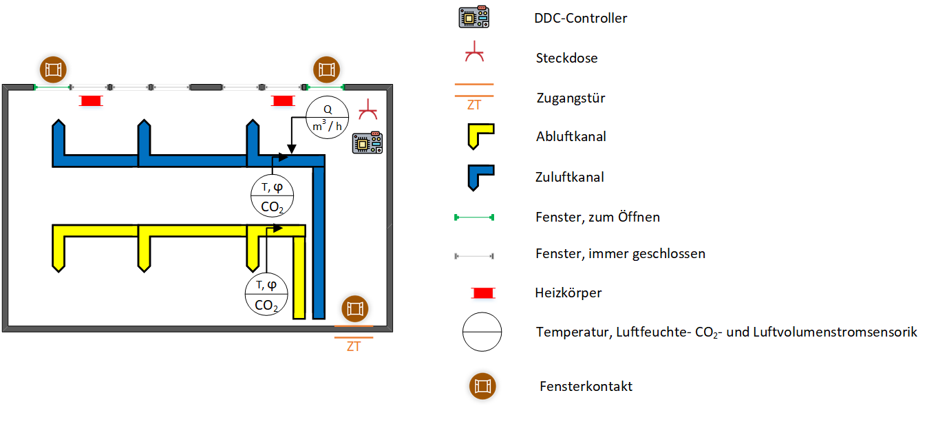 Für die Bewertung der Luftqualität ist eine Unterrichtseinheit als relevanter Messzeitraum anzusehen. Um diesen Messzeitraum aussagekräftig zu untersuchen ist es erforderlich mindestens einen Messwert pro Minute zu erfassen. Dies führt dazu, dass die eingesetzten Sensoren eine direkte elektrische Stromversorgung benötigen, weil batteriebetriebene Sensoren zur Energieeinsparung generell für längere Abtastraten ausgelegt sind. Da die hierfür benötigten Steckdosen jedoch häufig in Fensternähe platziert sind ist bei der Montage darauf zu achten, dass der Sensor nicht direkt von der Außenluft angeströmt wird. Dies ist bei einer der am Projekt beteiligten Schulen nicht möglich, weshalb hier ein noch auszuwählender Kanalsensor im Abluftkanal der Lüftungsanlage installiert wird, wie in [Abbildung 1] dargestellt.