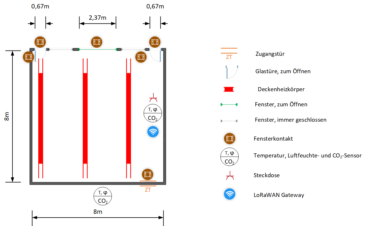 In [Abbildung 1] und [Abbildung 2] sind exemplarisch zwei der zu untersuchenden Unterrichtsräume und die jeweils ausgewählten Messkonzepte dargestellt.