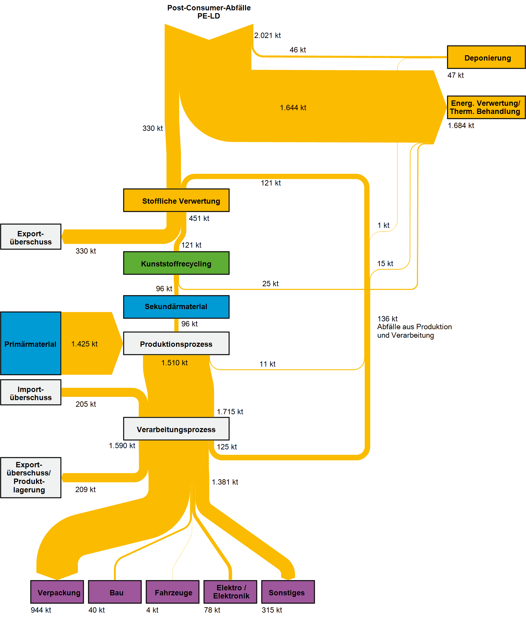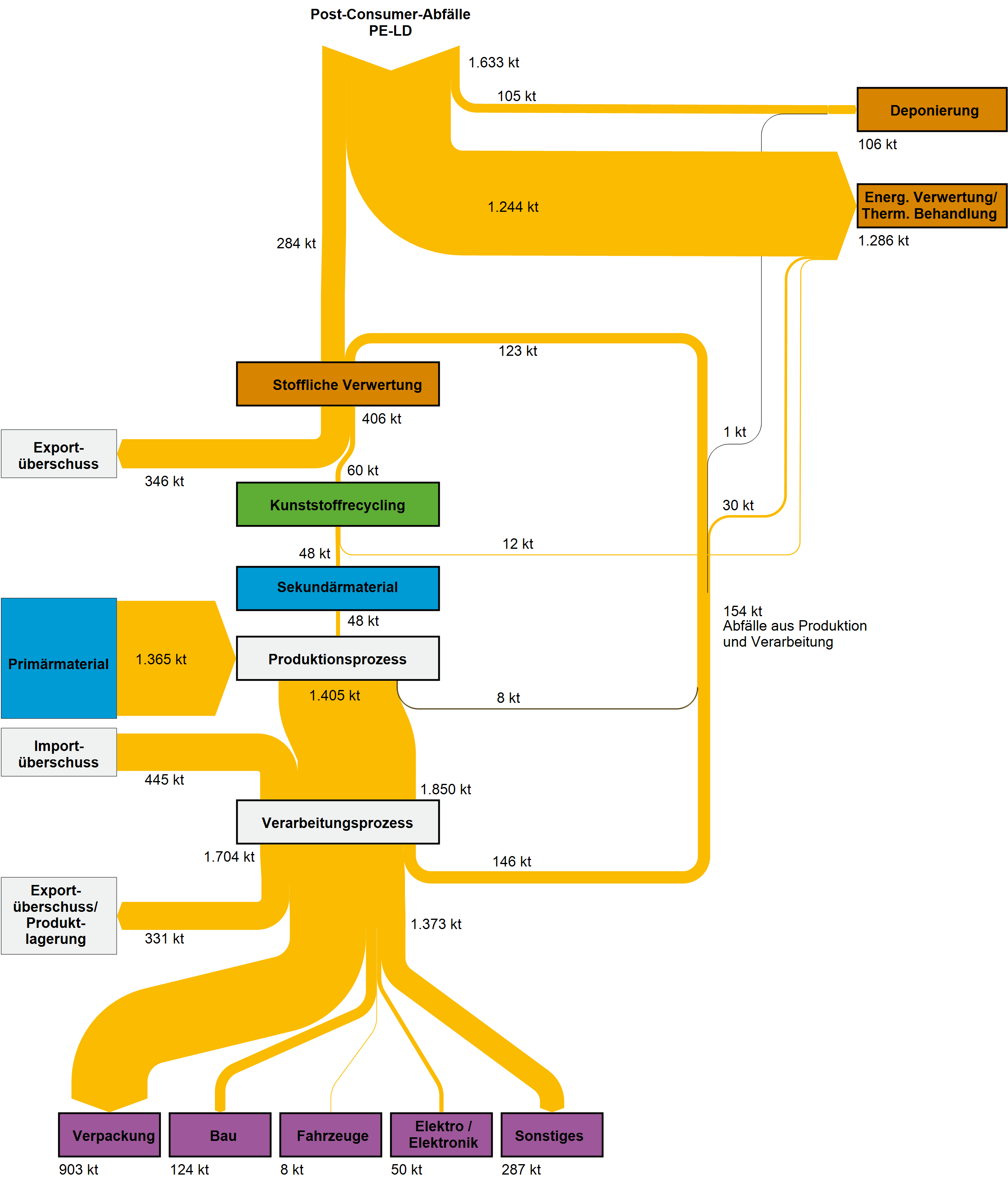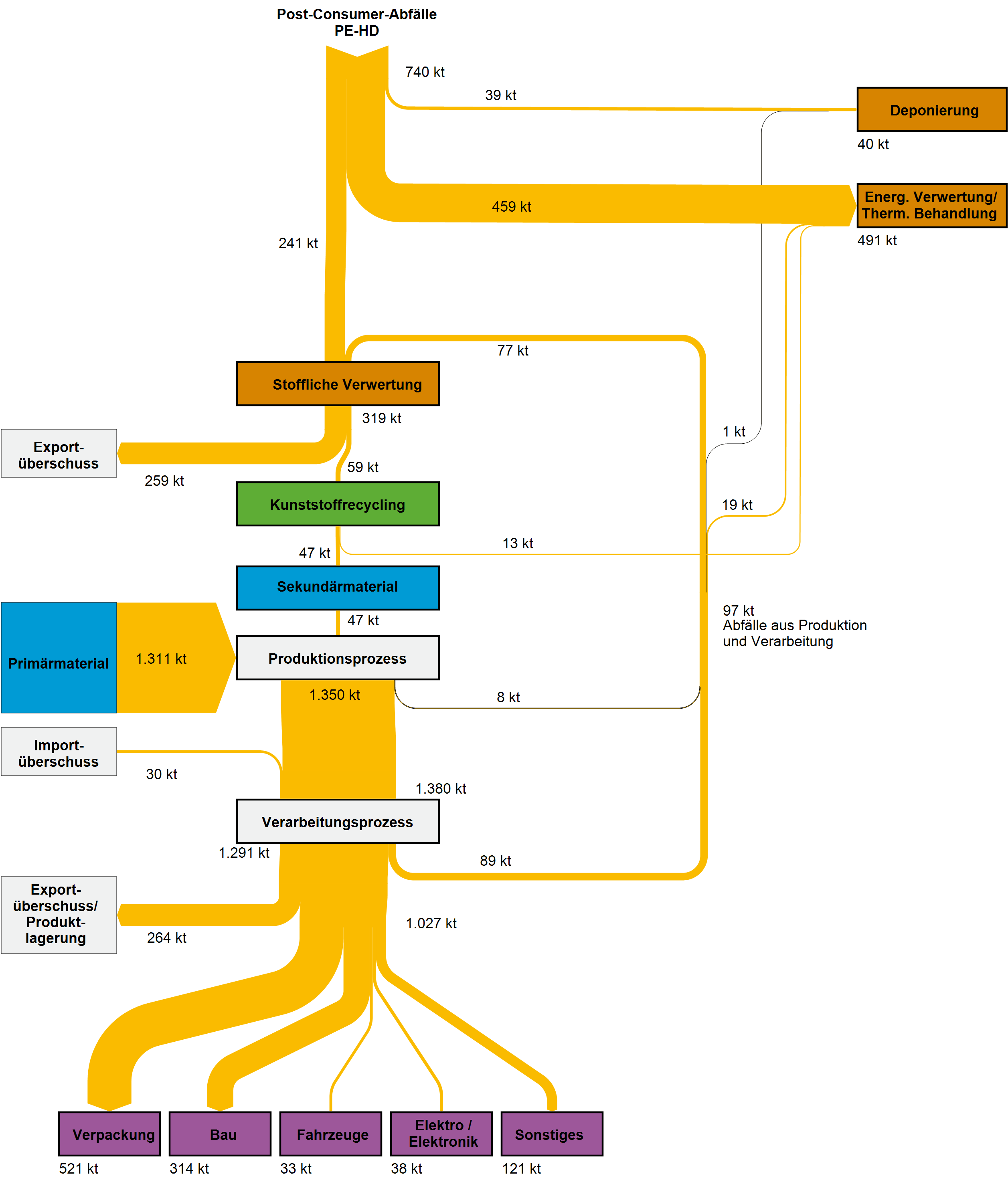 Die nachfolgenden Sankey-Diagramme in den Galerieboxen geben einen Überblick über die im Projekt ReSek abgeschätzten Stoffströme der Kunststoffe Polyethylen (PE-LD und PE-HD), Polypropylen (PP), Polyethylenterephthalat (PET), Polystyrol (PS) und Polyvinylchlorid (PVC) in Deutschland für das Jahr 2013. Hinterlegt sind ebenfalls die Sankey-Darstellungen für 2007 und eine Fortschreibung der Entwicklung für 2015. Eine weiterführende Erklärung zu den Stoffströmen und Modellannahmen ist dem Projektbericht ReSek (FKZ 3714 93 330 0) zu entnehmen.