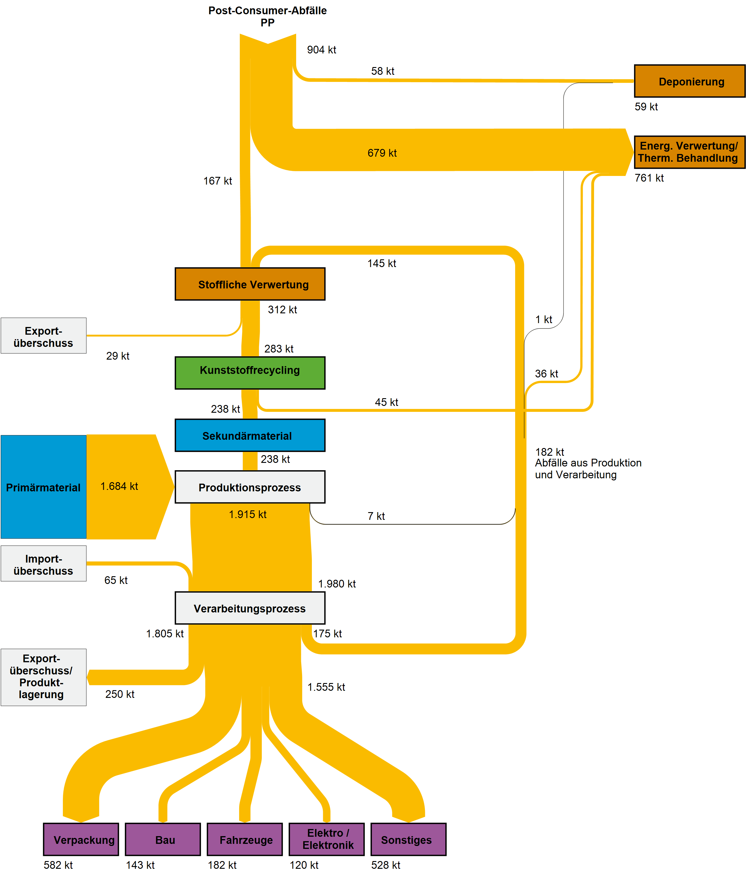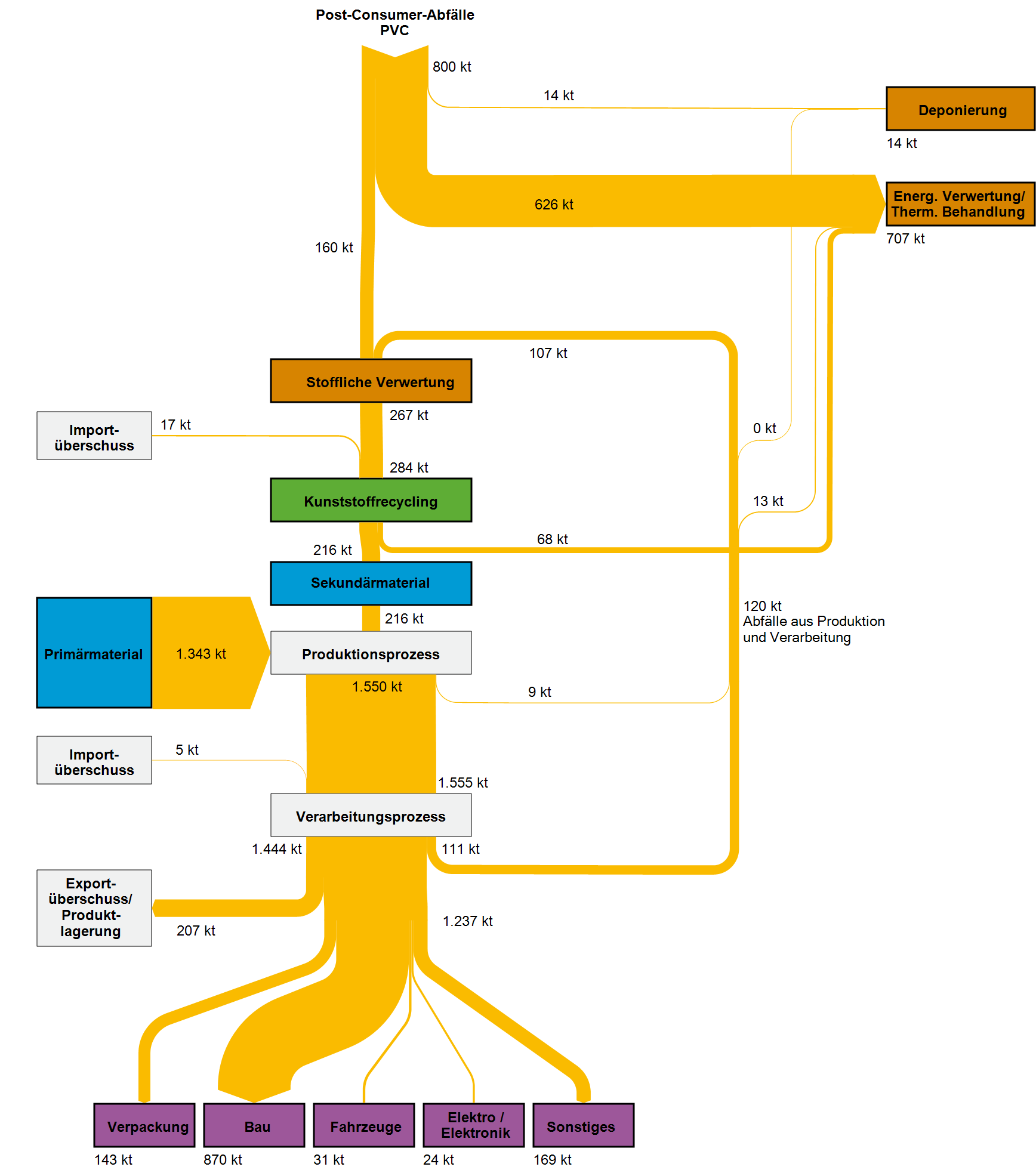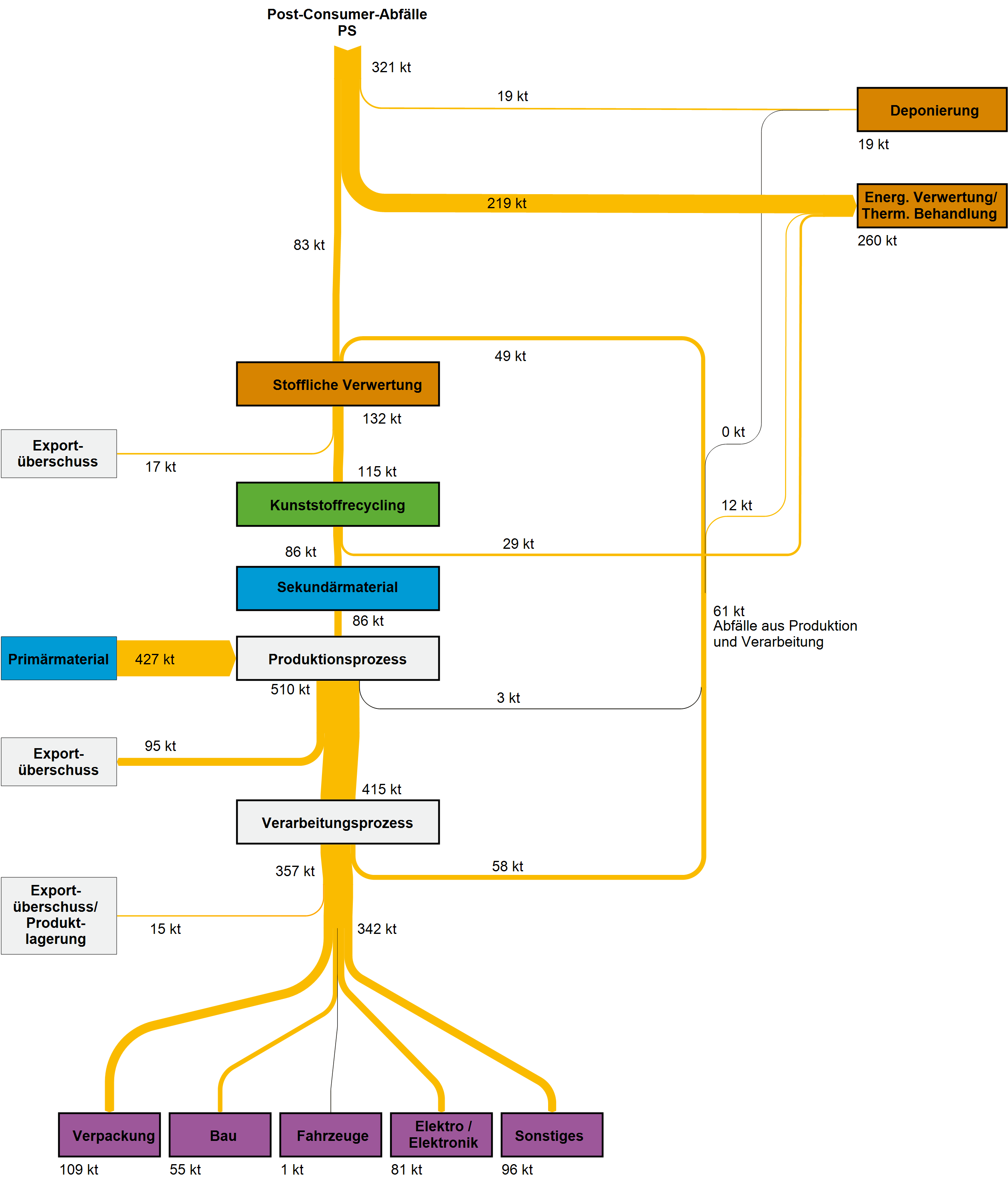 Die nachfolgenden Sankey-Diagramme in den Galerieboxen geben einen Überblick über die im Projekt ReSek abgeschätzten Stoffströme der Kunststoffe Polyethylen (PE-LD und PE-HD), Polypropylen (PP), Polyethylenterephthalat (PET), Polystyrol (PS) und Polyvinylchlorid (PVC) in Deutschland für das Jahr 2013. Hinterlegt sind ebenfalls die Sankey-Darstellungen für 2007 und eine Fortschreibung der Entwicklung für 2015. Eine weiterführende Erklärung zu den Stoffströmen und Modellannahmen ist dem Projektbericht ReSek (FKZ 3714 93 330 0) zu entnehmen.