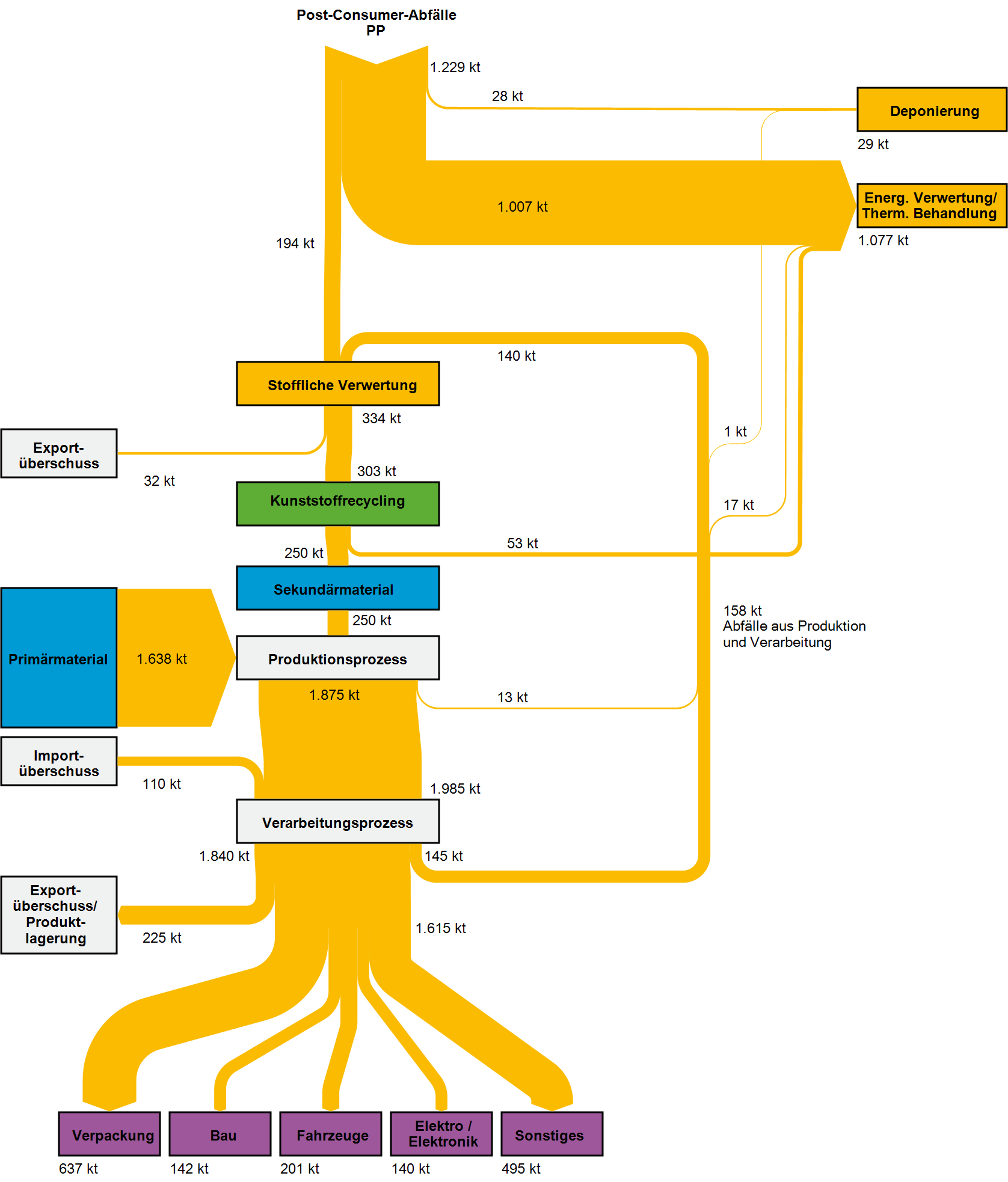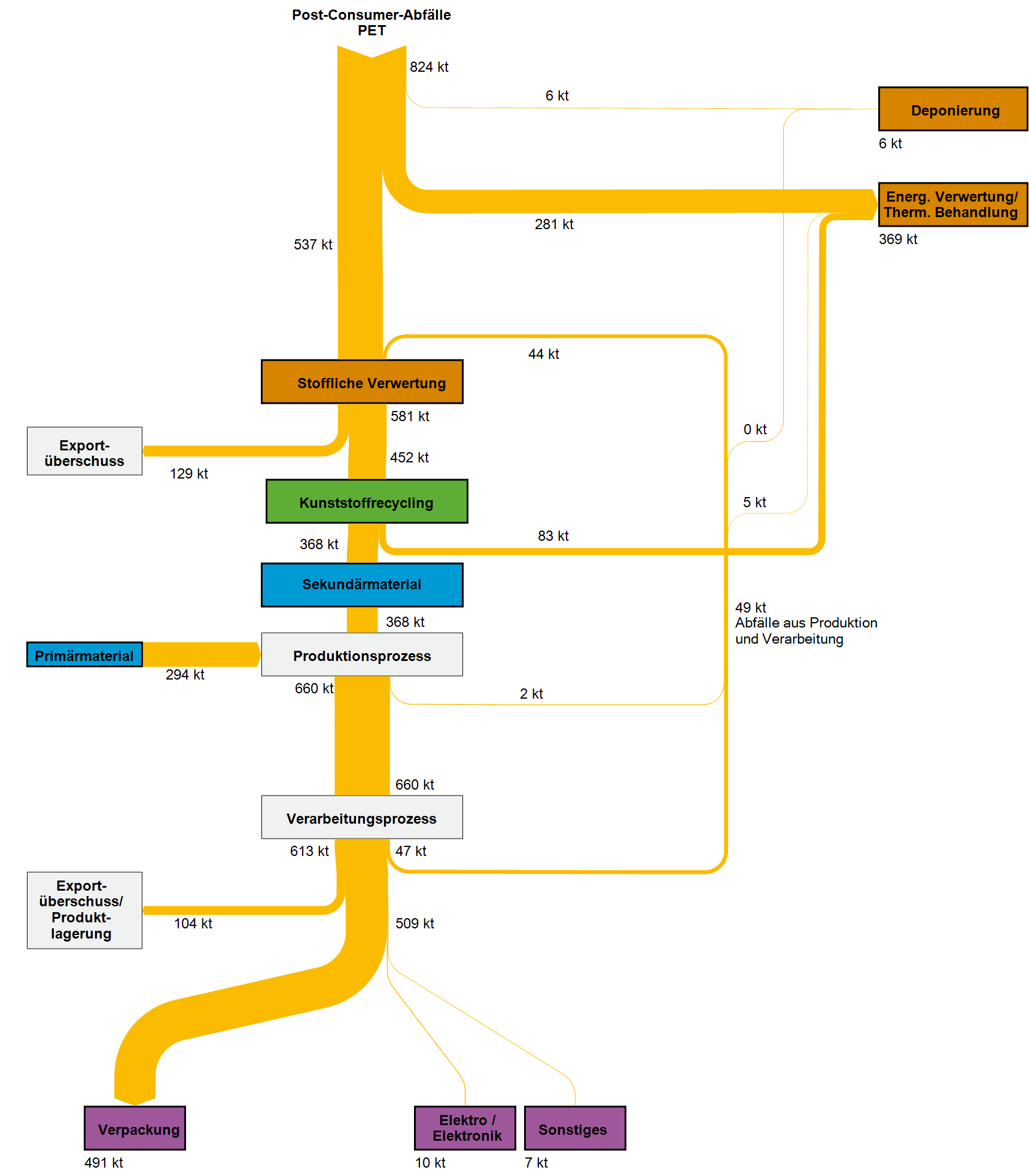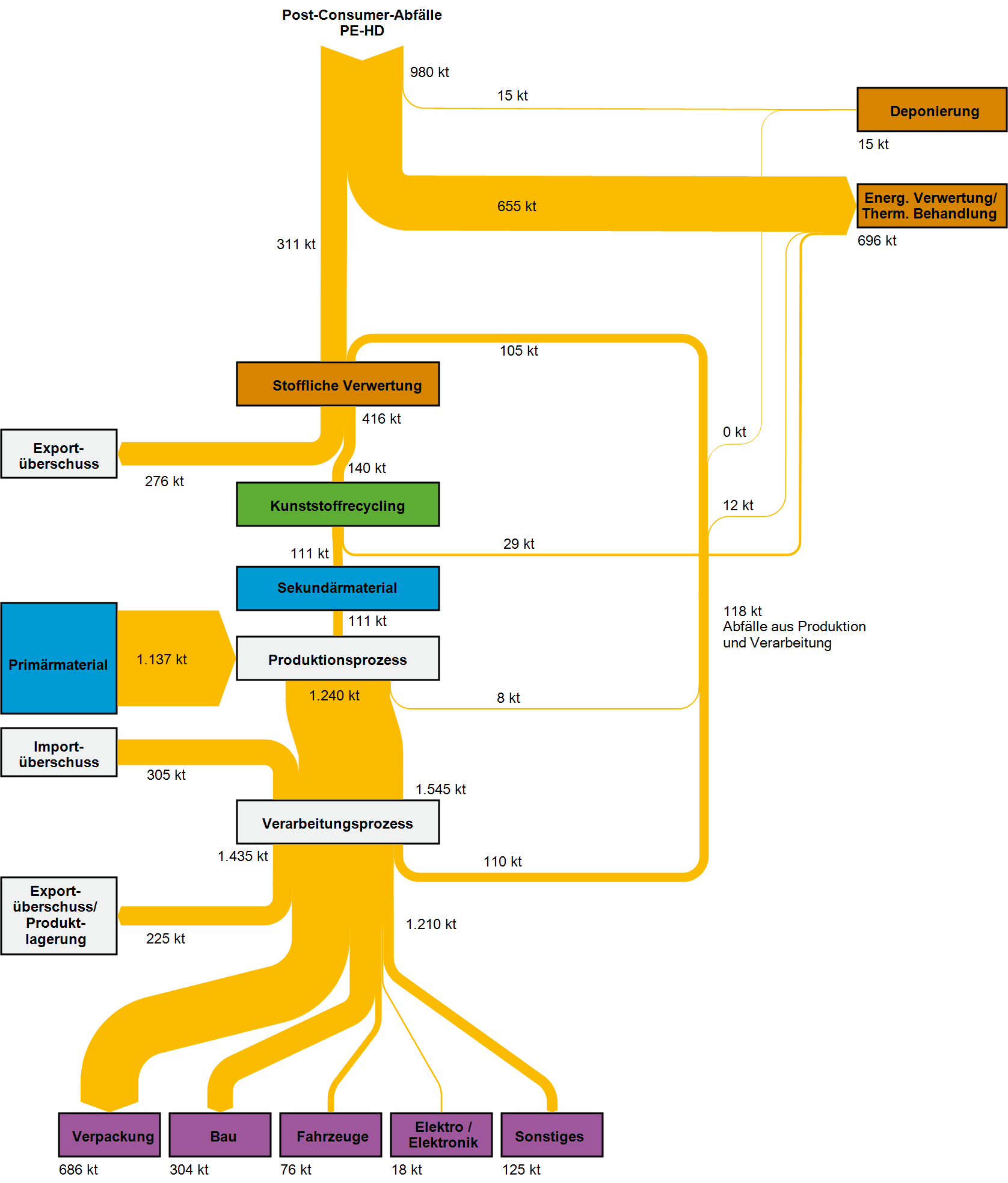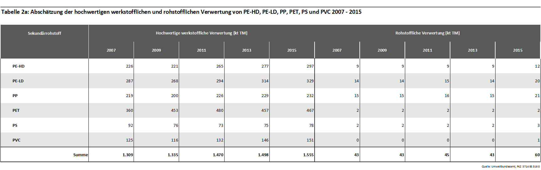 Grundsätzlich sind alle hier betrachteten Kunststoffe thermoplastisch und aufgrund ihrer geringen Verzweigung der Polymerketten für ein hochwertiges werkstoffliches Recycling geeignet. Diese Form des Recyclings setzt allerdings Sortenreinheit und eine hohe Qualität der Sekundärrohstoffe voraus, welche im Zuge der Abfallaufbereitung nicht immer gewährleistet werden kann. Entscheidend für den Anteil eingesetzter Sekundärkunststoffe bei Herstellungsprozessen sind die Qualitätsanforderungen der Produkte. Aus den hier geforderten Materialeigenschaften resultieren die Vorgaben an Reinheitsgrad bzw. Störstoffanteil der bei der Kunststoffherstellung eingesetzten Sekundärmaterialien.