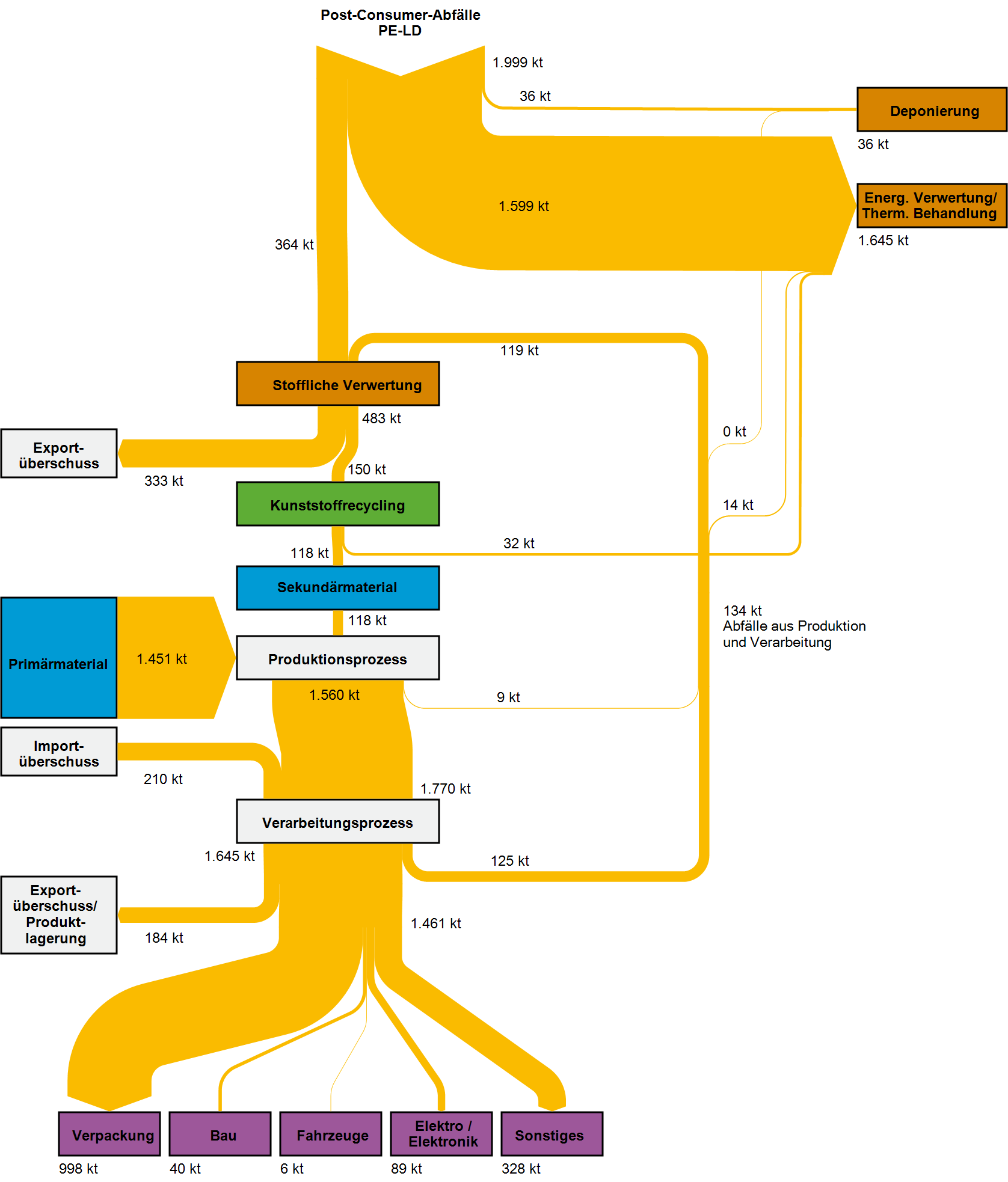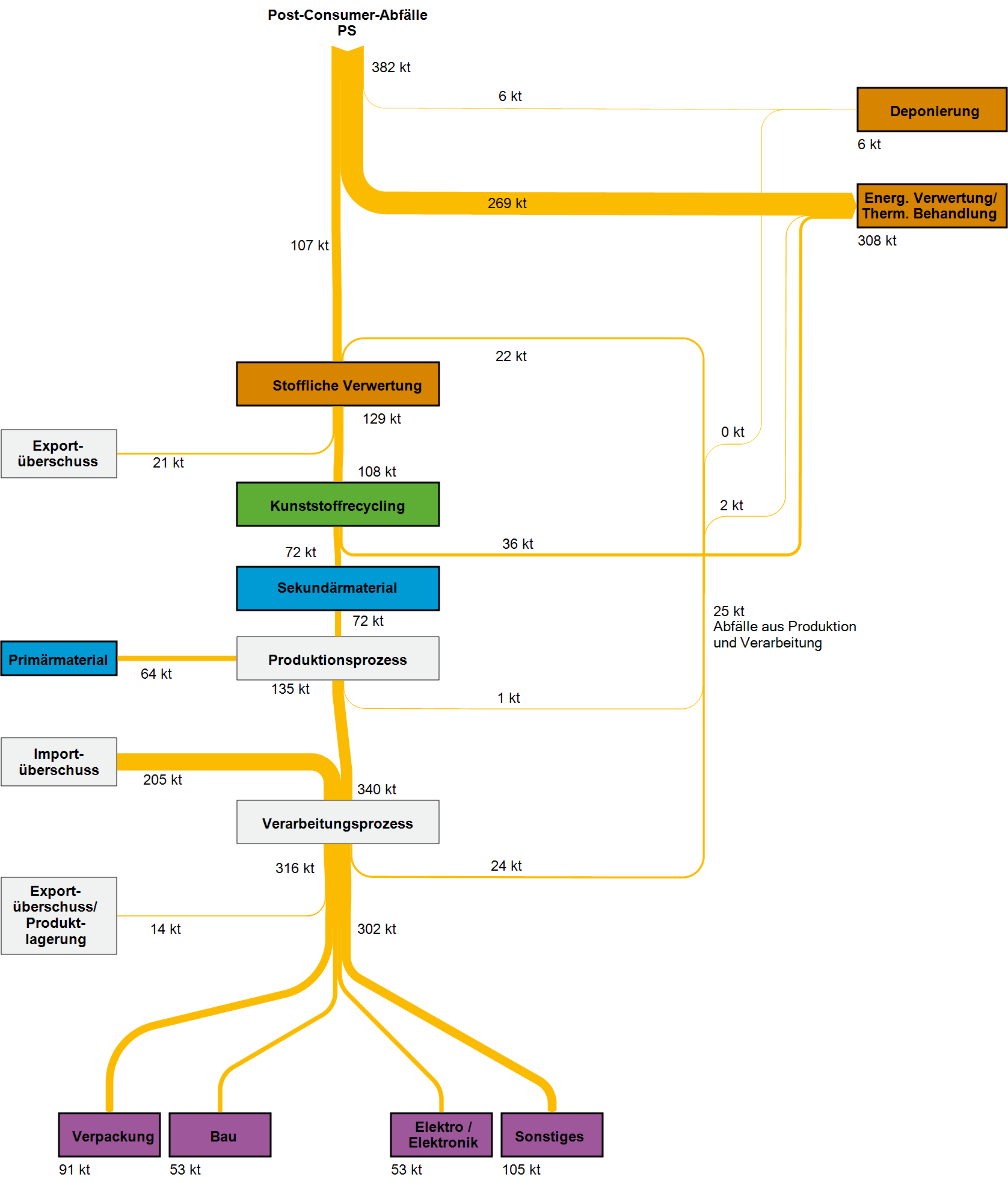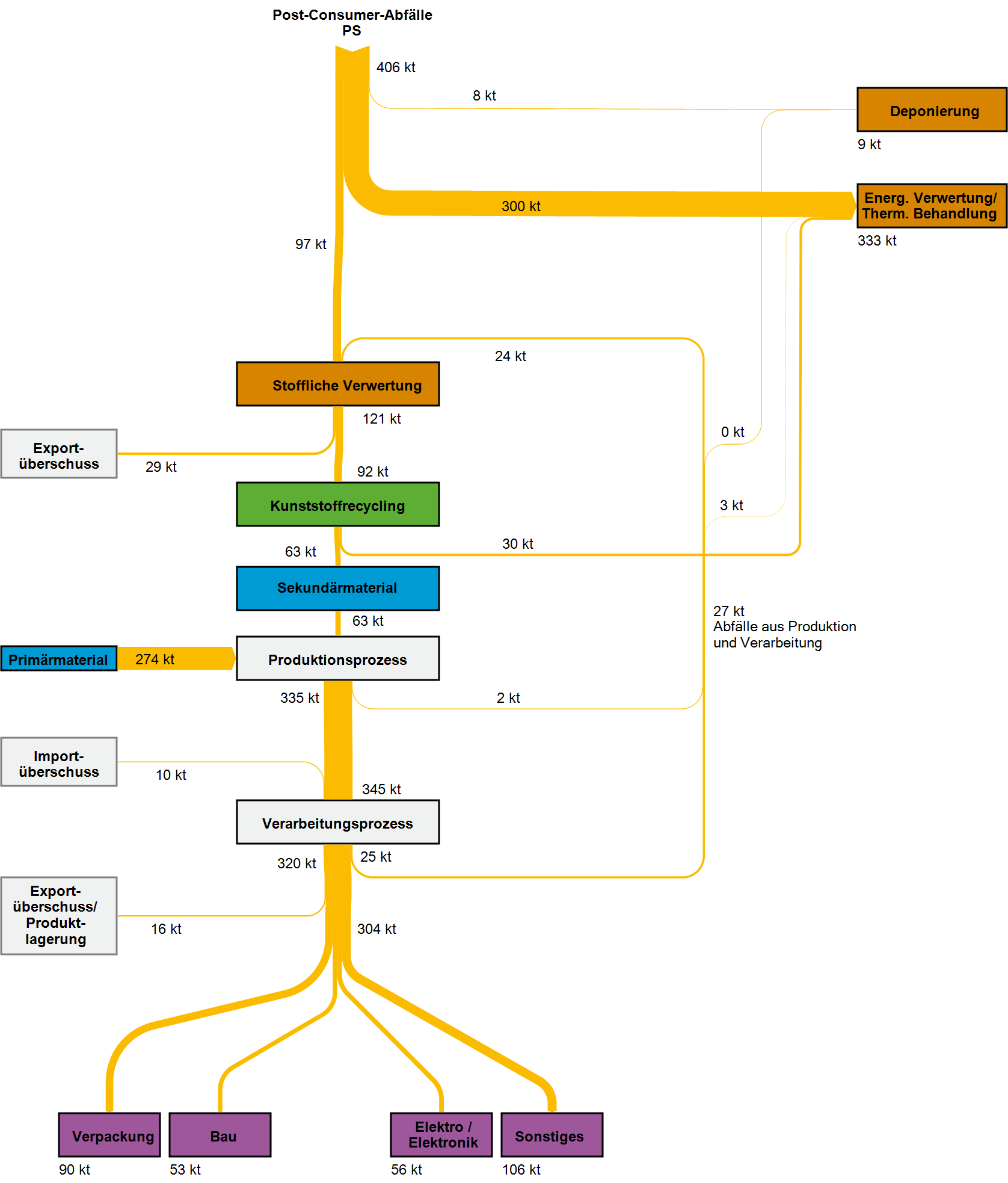 Ein Teil der stofflichen Verwertung von Kunststoffabfällen findet im EU- und Nicht-EU-Ausland statt.  Aufgrund der veränderten Rahmenbedingungen im globalen Handel mit Kunststoffabfällen sinken die aus Deutschland exportierten Mengen seit 2016. Die importierten Kunststoffabfallmengen gingen ebenfalls zurück.  Die auch beim Export angestrebte Substitutionswirkung auf Primärkunststoffe geht auf die innerdeutschen Bemühungen der Getrenntsammlung und Abfallbehandlung zurück und lässt sich der deutschen Sekundärrohstoffwirtschaft anrechnen. Allerdings unterliegen nicht alle exportierten Kunststoffabfälle einer verlässlichen Nachweispflicht, von der auf eine hochwertige werkstoffliche Verwertung geschlossen werden kann.