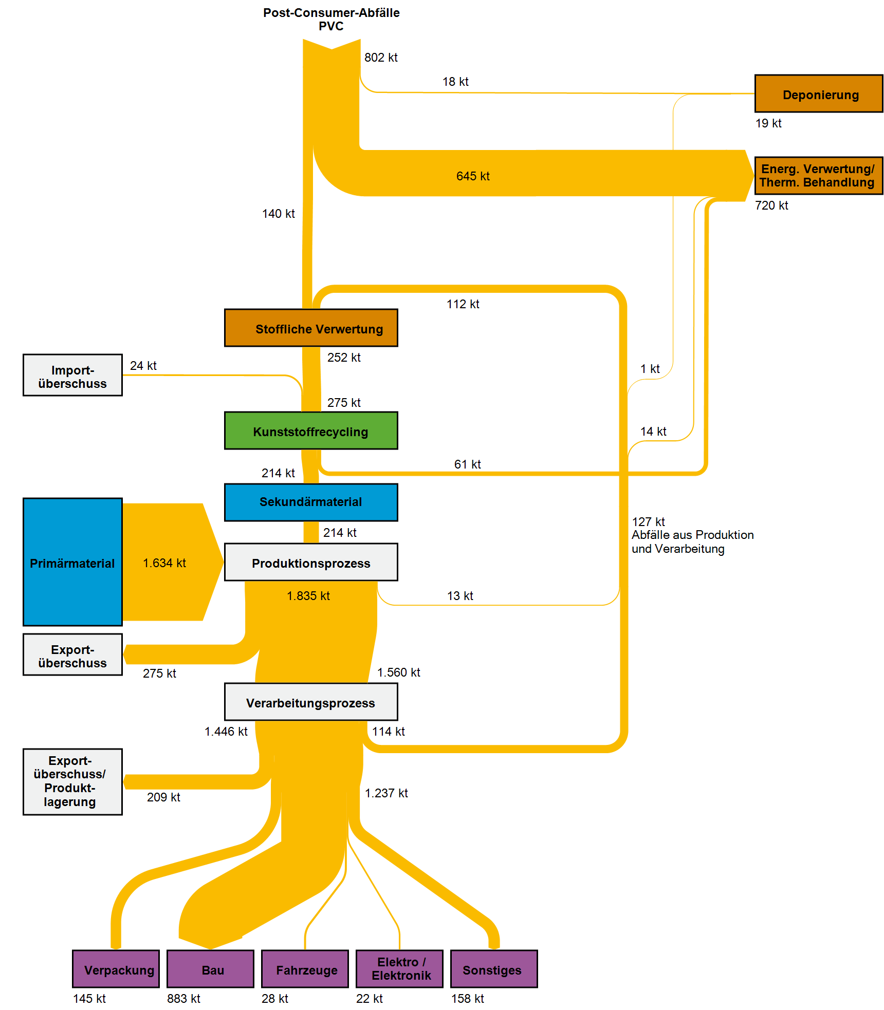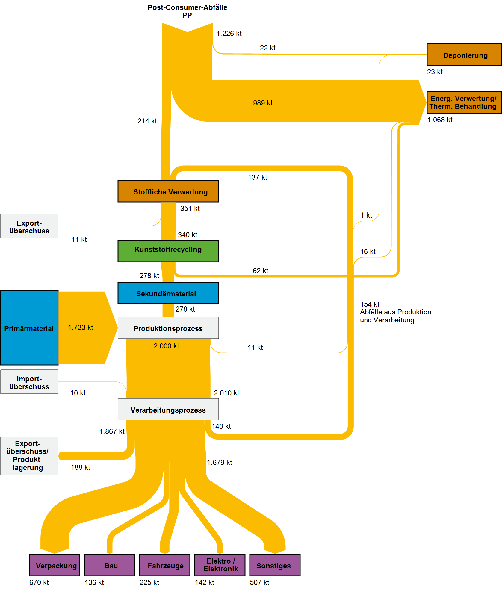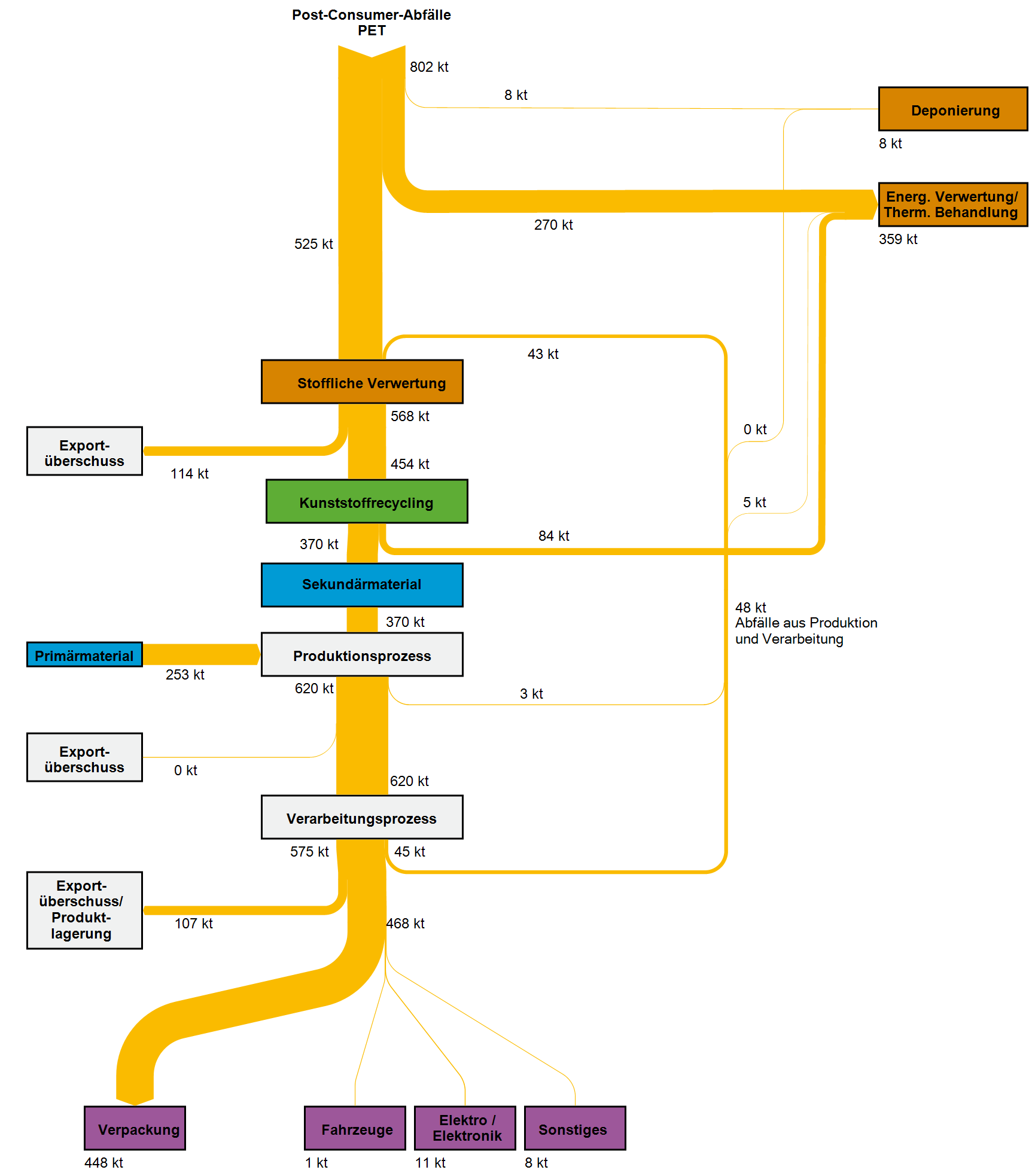 Ein Teil der stofflichen Verwertung von Kunststoffabfällen findet im EU- und Nicht-EU-Ausland statt.  Aufgrund der veränderten Rahmenbedingungen im globalen Handel mit Kunststoffabfällen sinken die aus Deutschland exportierten Mengen seit 2016. Die importierten Kunststoffabfallmengen gingen ebenfalls zurück.  Die auch beim Export angestrebte Substitutionswirkung auf Primärkunststoffe geht auf die innerdeutschen Bemühungen der Getrenntsammlung und Abfallbehandlung zurück und lässt sich der deutschen Sekundärrohstoffwirtschaft anrechnen. Allerdings unterliegen nicht alle exportierten Kunststoffabfälle einer verlässlichen Nachweispflicht, von der auf eine hochwertige werkstoffliche Verwertung geschlossen werden kann.
