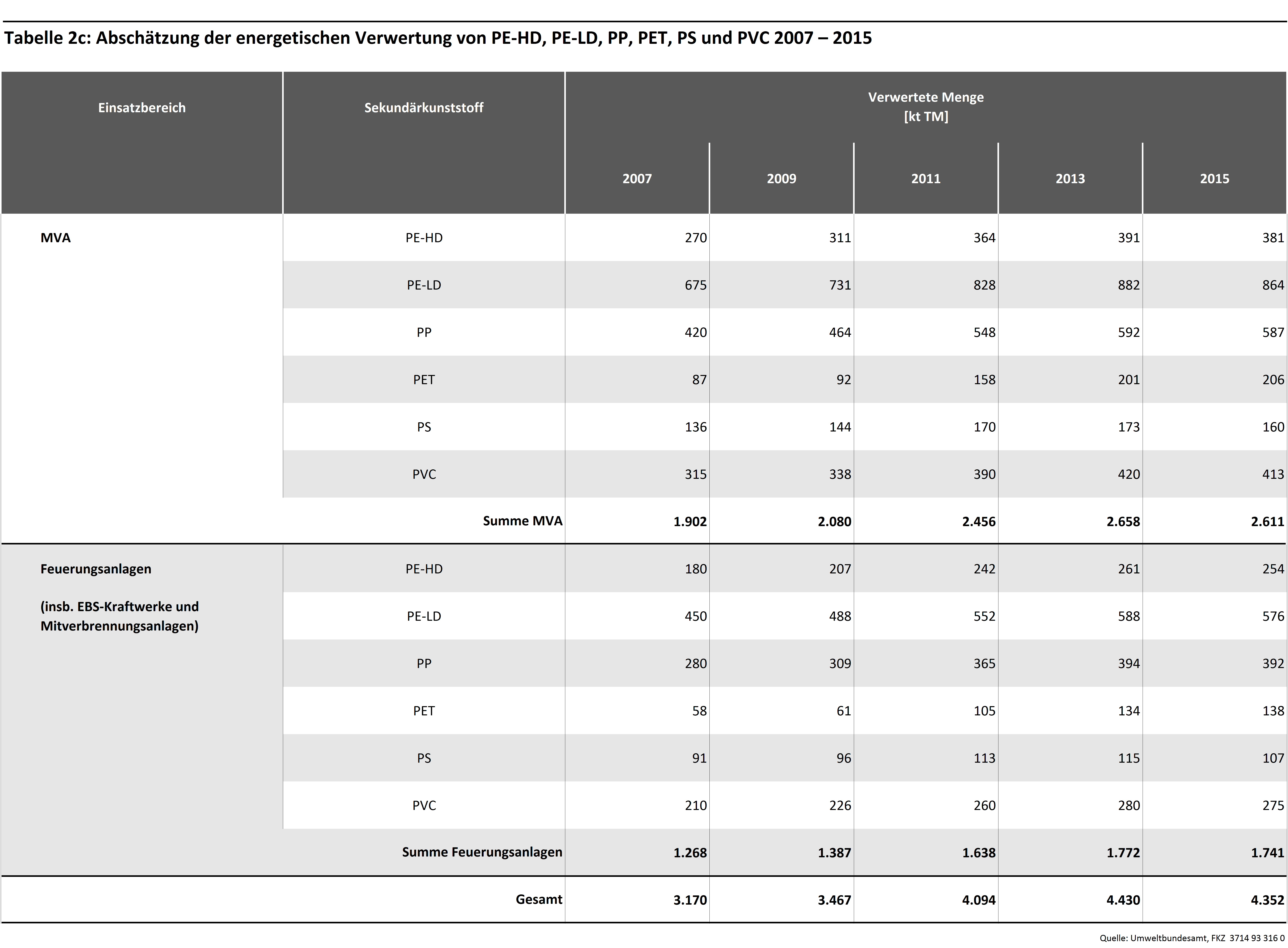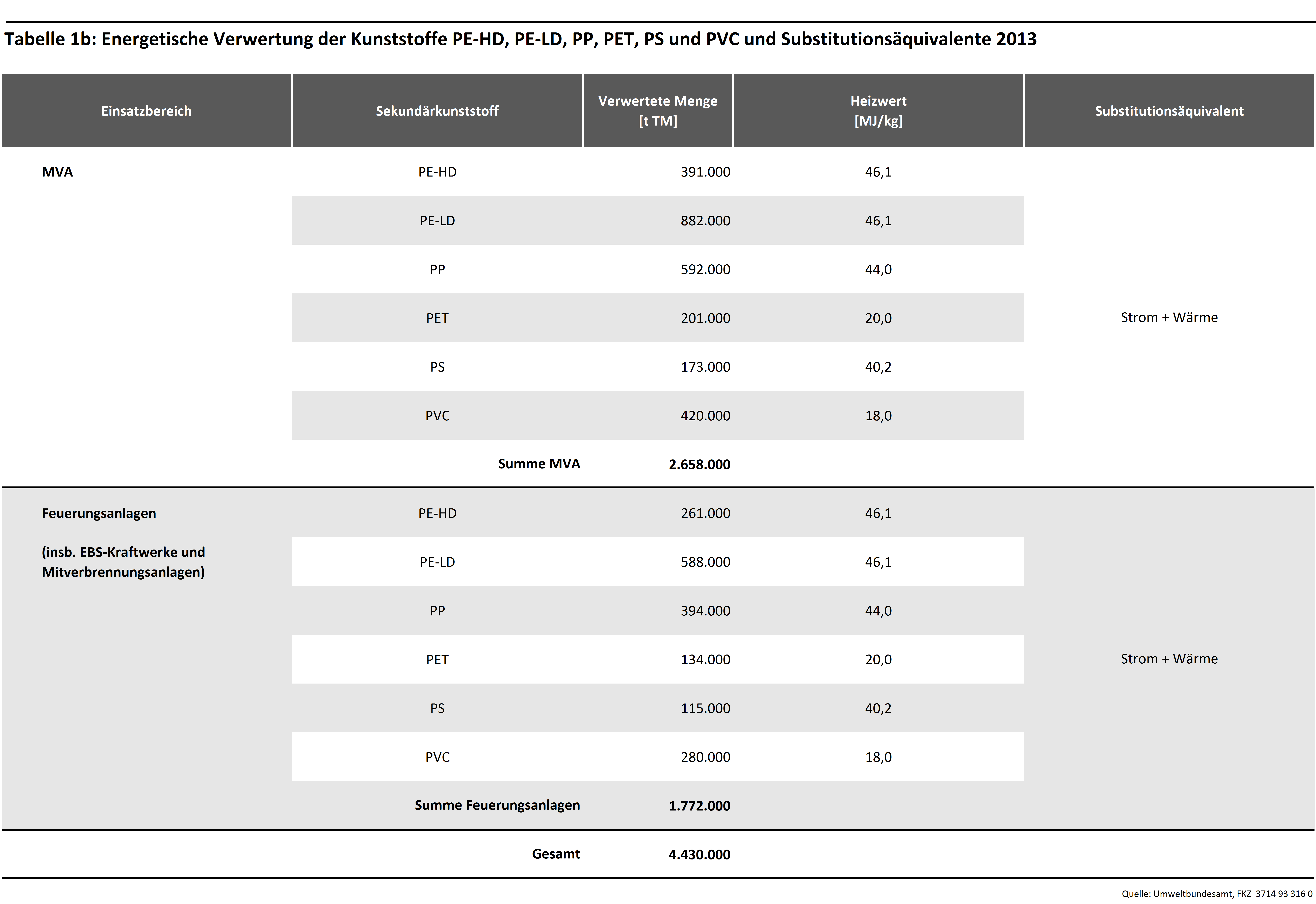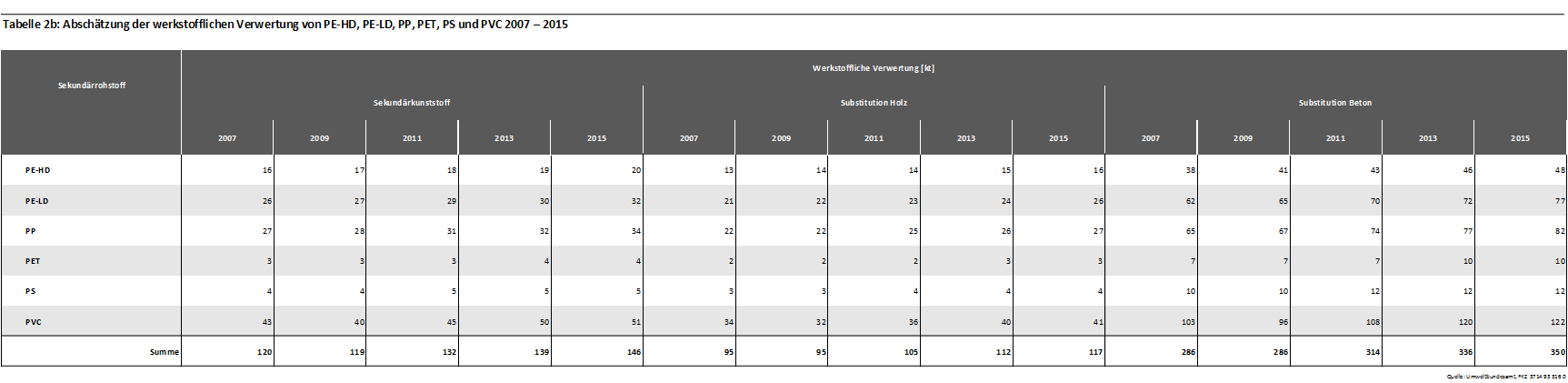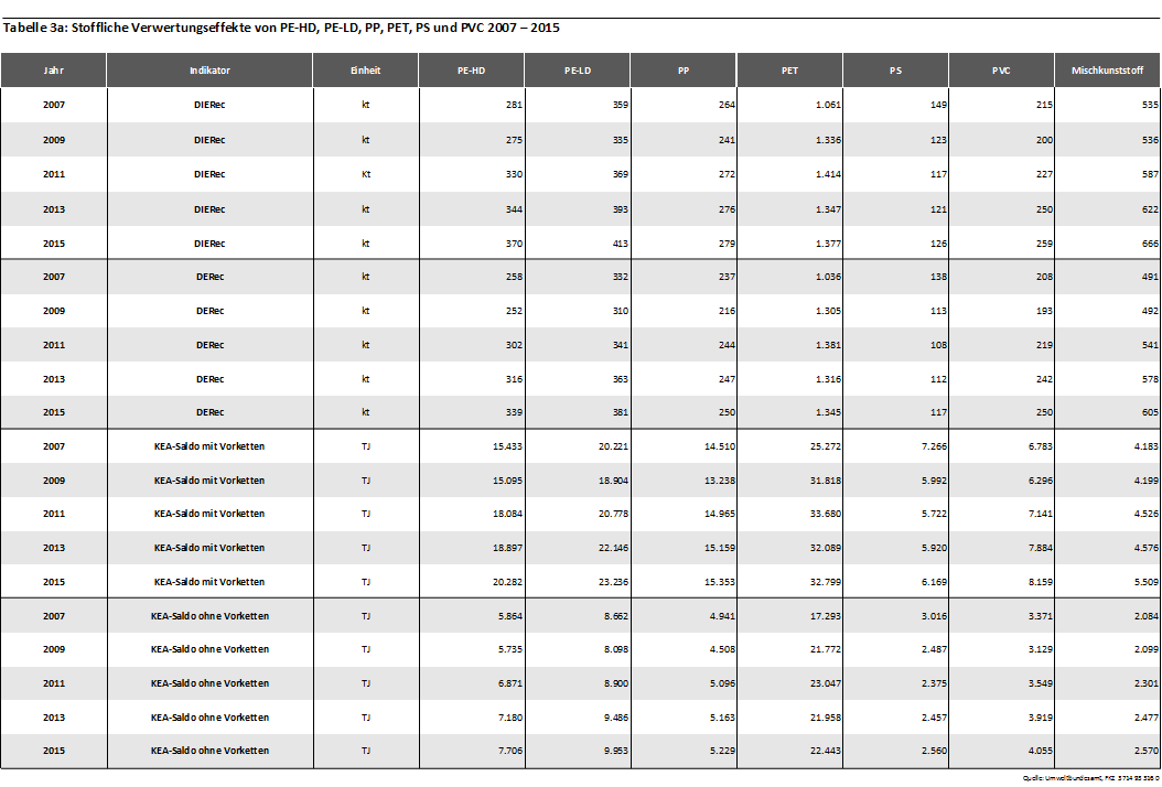 Die folgenden Tabellen geben die Sekundärerzeugnisse und Verwertungswege von Kunststoffen in Deutschland, die zur Bilanzierung berücksichtigten Substitutionsäquivalente sowie Zeitreihen der angenommenen Verwertungsmengen wieder. Es wird dabei eine Differenzierung nach stofflicher und energetischer Verwertung vorgenommen. Die stoffliche Verwertung ist zusätzlich in hochwertige werkstoffliche, werkstoffliche und rohstoffliche Verwertung untergliedert.