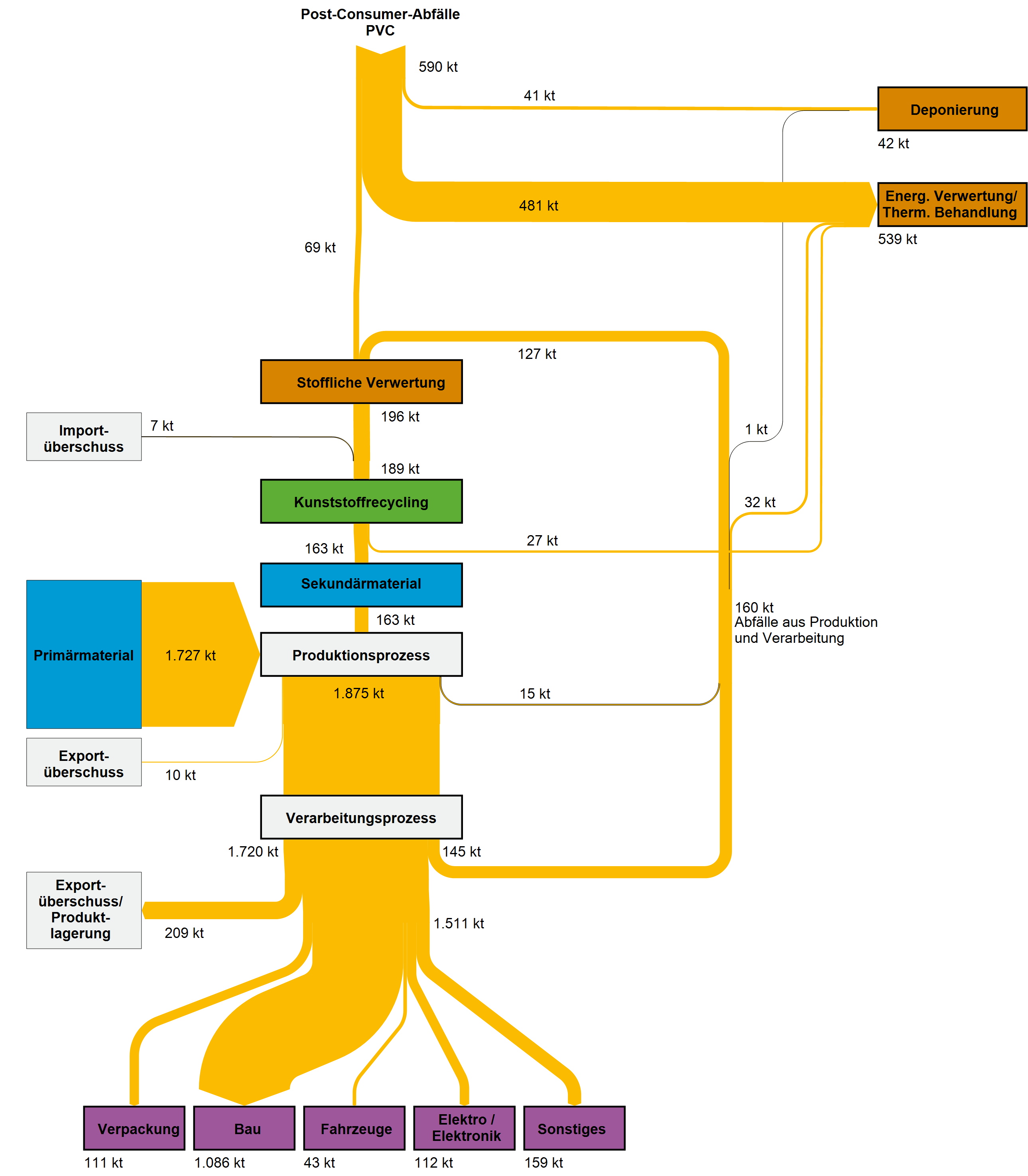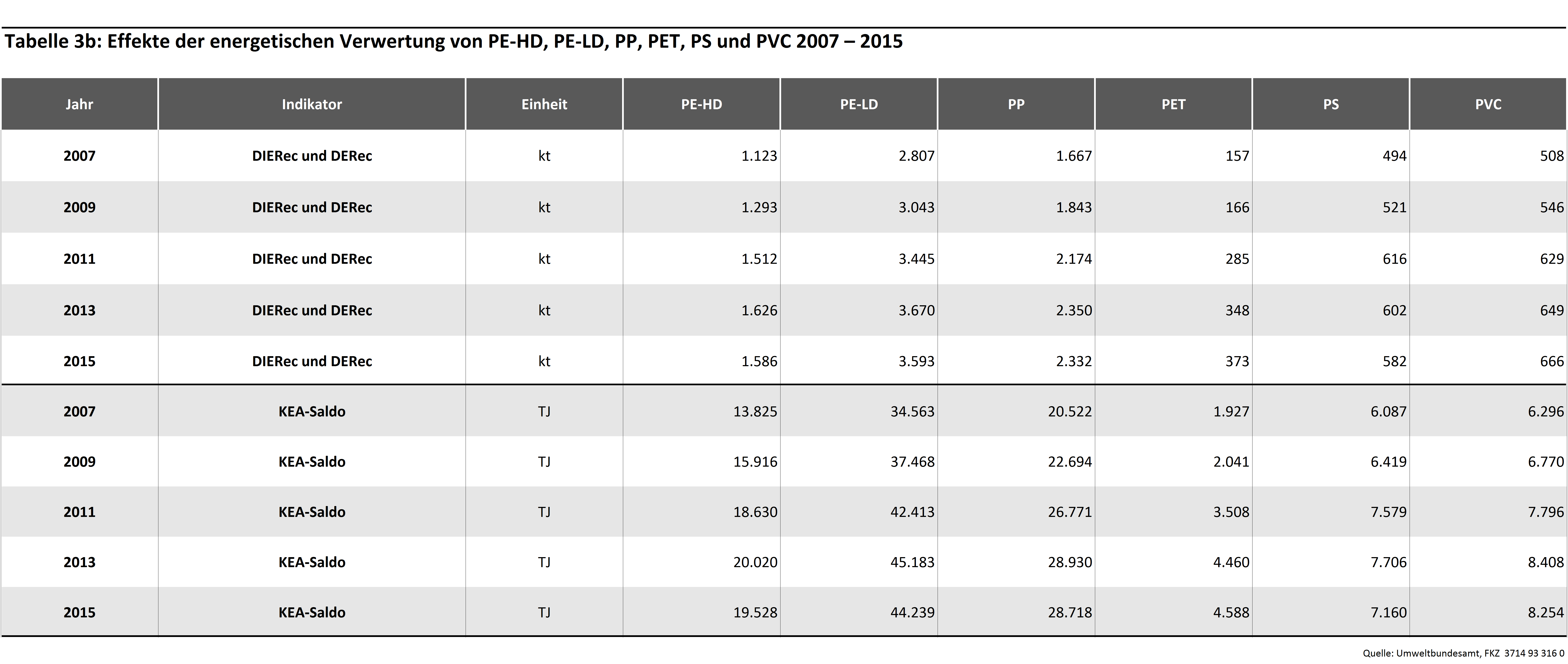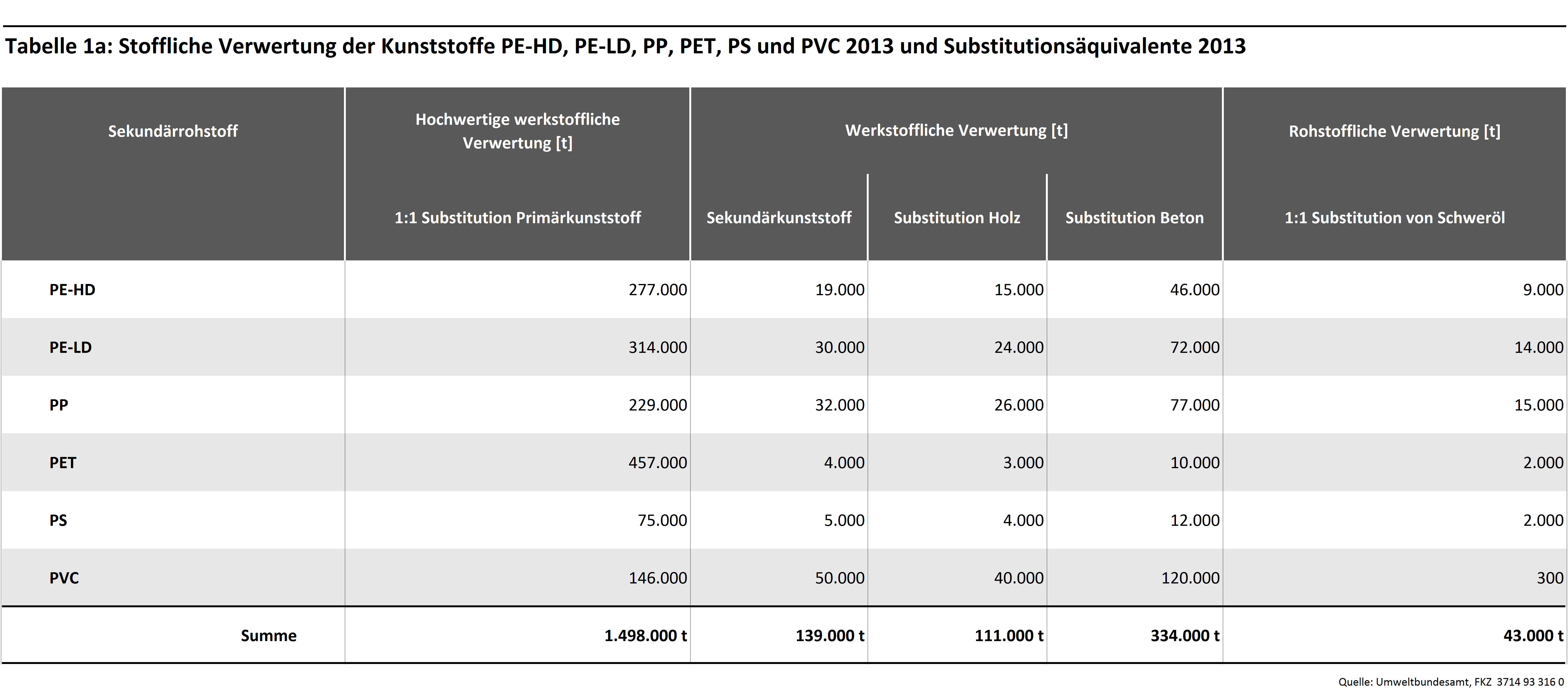 Die folgenden Tabellen geben die Sekundärerzeugnisse und Verwertungswege von Kunststoffen in Deutschland, die zur Bilanzierung berücksichtigten Substitutionsäquivalente sowie Zeitreihen der angenommenen Verwertungsmengen wieder. Es wird dabei eine Differenzierung nach stofflicher und energetischer Verwertung vorgenommen. Die stoffliche Verwertung ist zusätzlich in hochwertige werkstoffliche, werkstoffliche und rohstoffliche Verwertung untergliedert.