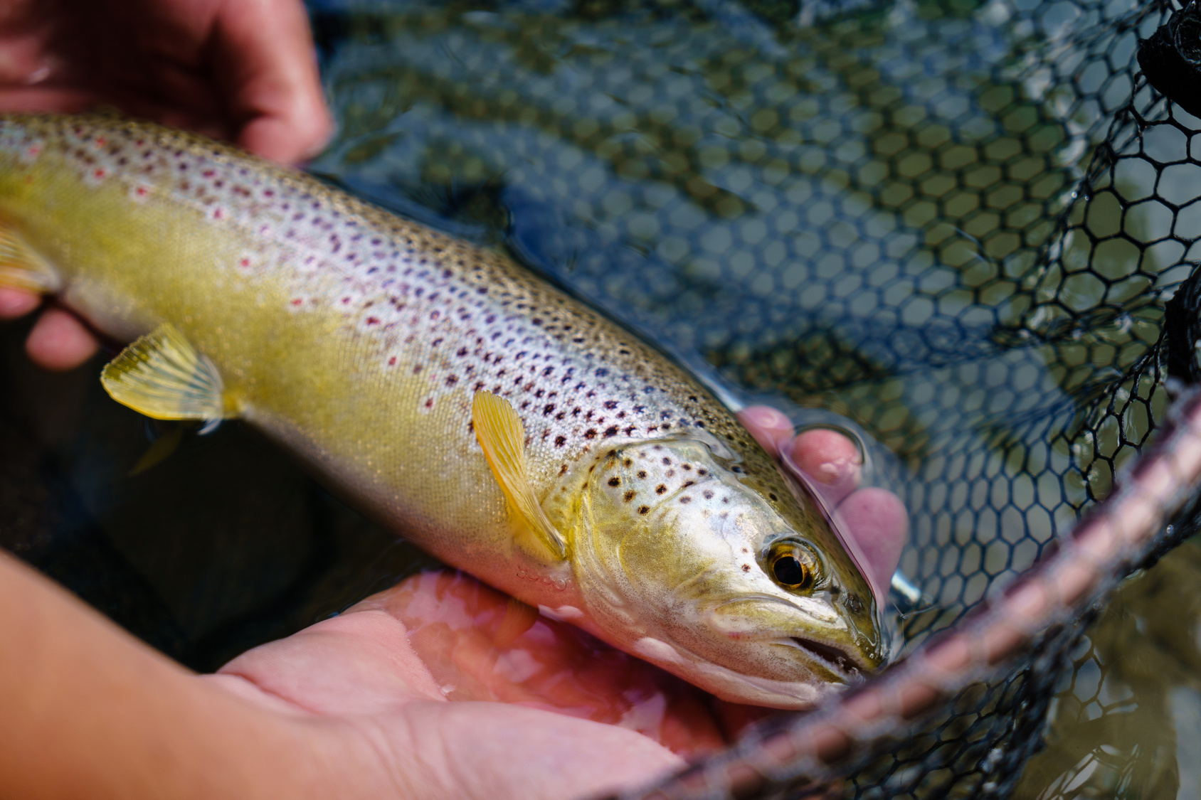 Foto: Zwei Hände halten eine Bachforelle in einem Netz.