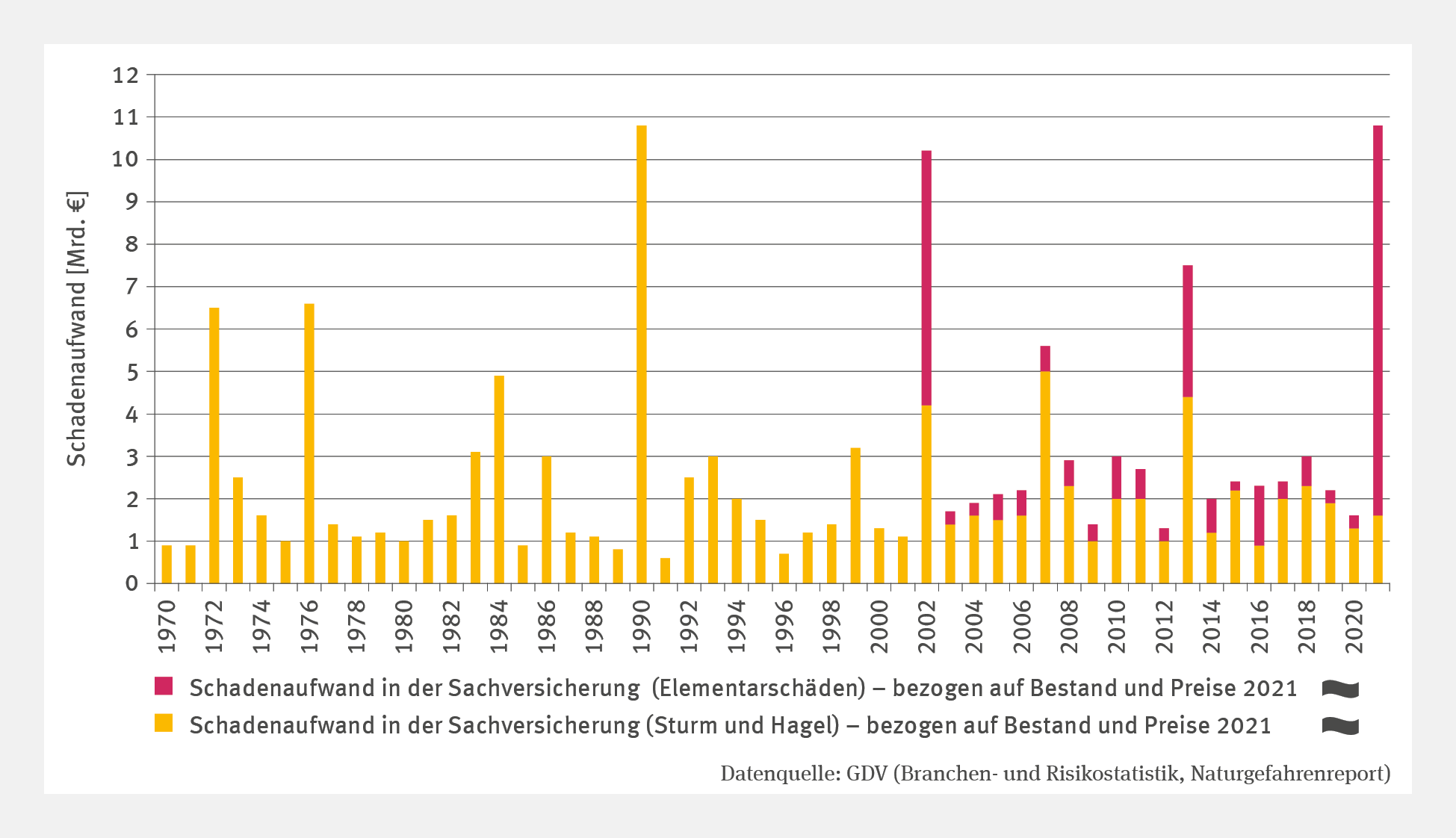 Die Zeitreihe des Schadenaufwands in der Sachversicherung zeigt bisher weder für Sturm und Hagel noch für die Elementarschäden einen signifikanten Trend. Es gibt aber immer wieder Jahre, in denen einzelne Extremereignisse den Schadenaufwand in die Höhe treiben. Nach der Jahrtausendwende gehört hierzu zunächst das Jahr 2002, in dem das August-Hochwasser und außerdem mehrere Orkane, insbesondere der Orkan Jeanett, sehr massive Schäden anrichteten. Das Orkantief Kyrill im Januar 2007 beeinträchtigte das öffentliche Leben in weiten Teilen Europas und forderte europaweit 47 Todesopfer. Im Jahr 2013 trieben gleich fünf größere Hagelereignisse die Schäden in die Höhe: Manni und Norbert im Juni, Andreas und Bernd im Juli sowie Ernst im August. Das Juni-Hochwasser im selben Jahr verursachte, hochgerechnet auf Bestand und Preise des Jahres 2021, noch einmal Schäden in Höhe von 2,38 Mrd. Euro. Im Januar 2018 verursachte das Orkantief Friederike in Deutschland Schäden in Höhe von 900 Mio. Euro.