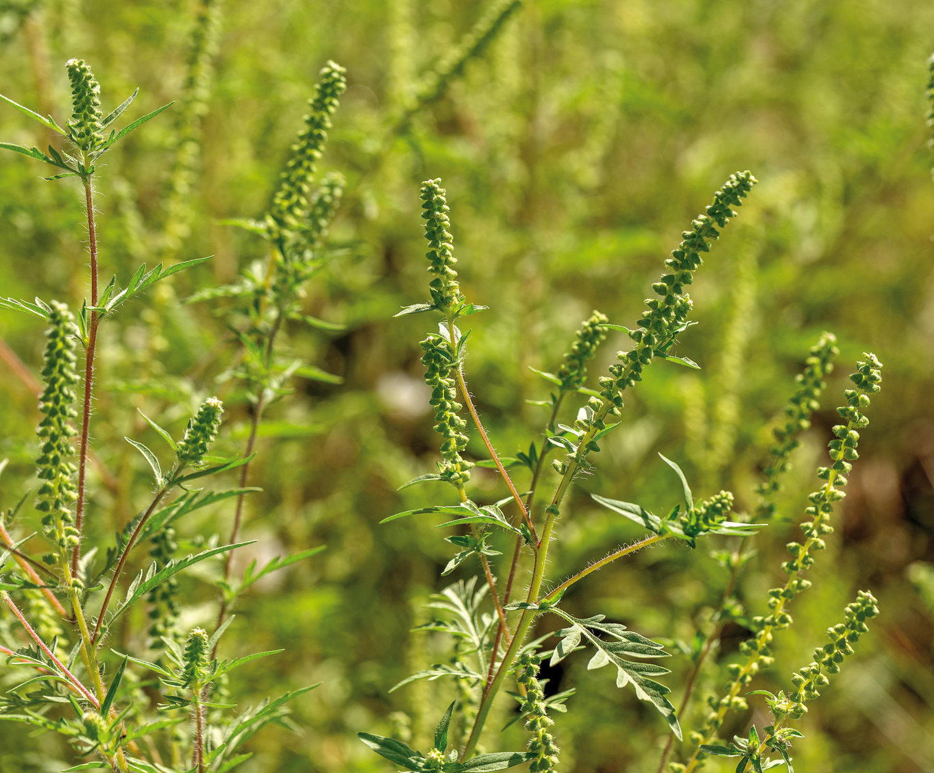 Die Pollen der Ambrosie können bei sensibilisierten Personen bereits bei geringen Pollenkonzentrationen allergische Symptome und bei bis zu einem Viertel der betroffenen Allergiker*innen Asthma auslösen23. Ferner wird von seltenen Hautreaktionen nach Hautkontakt mit dem Blütenstand oder anderen Pflanzenbestandteilen berichtet. Hinzu kommt, dass sich mit der Etablierung der Ambrosie die Pollenflugzeit bis in den Oktober hinein verlängert24, da die Pflanze zu den Spätblühern zählt. Durch die zeitliche Ausweitung der Pollenflugzeit verlängert sich auch die Beschwerdezeit. Dies bedeutet eine zusätzliche Belastung für Menschen, die unter Allergien leiden.