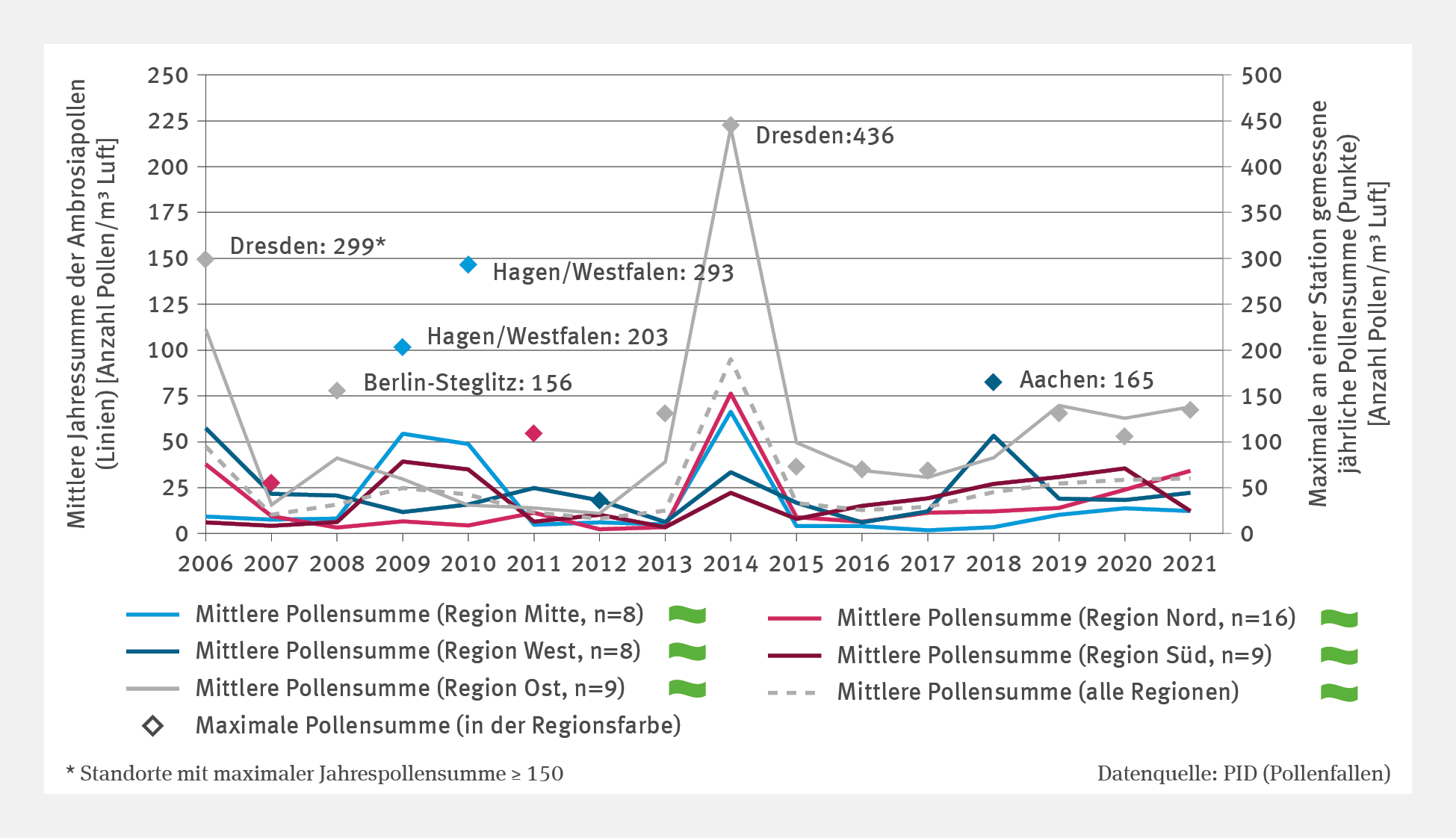 Die Grafik „Belastung mit Ambrosiapollen“ zeigt die mittlere Jahressumme in Tausend Pollen pro Quadratmeter Luft von 2006 bis 2021 für die Regionen Mitte, Nord, Ost, Süd und West sowie den Durchschnitt. Besonders hohe Belastung 2014: In der Region Ost knapp 225.000 Pollen, Höchstwert an der Station Dresden mit 436.000 Pollen. Punkte markieren die maximale jährliche Pollensumme je Region. Signifikante Trends sind nicht erkennbar. GE-I-4: Belastung mit Ambrosiapollen