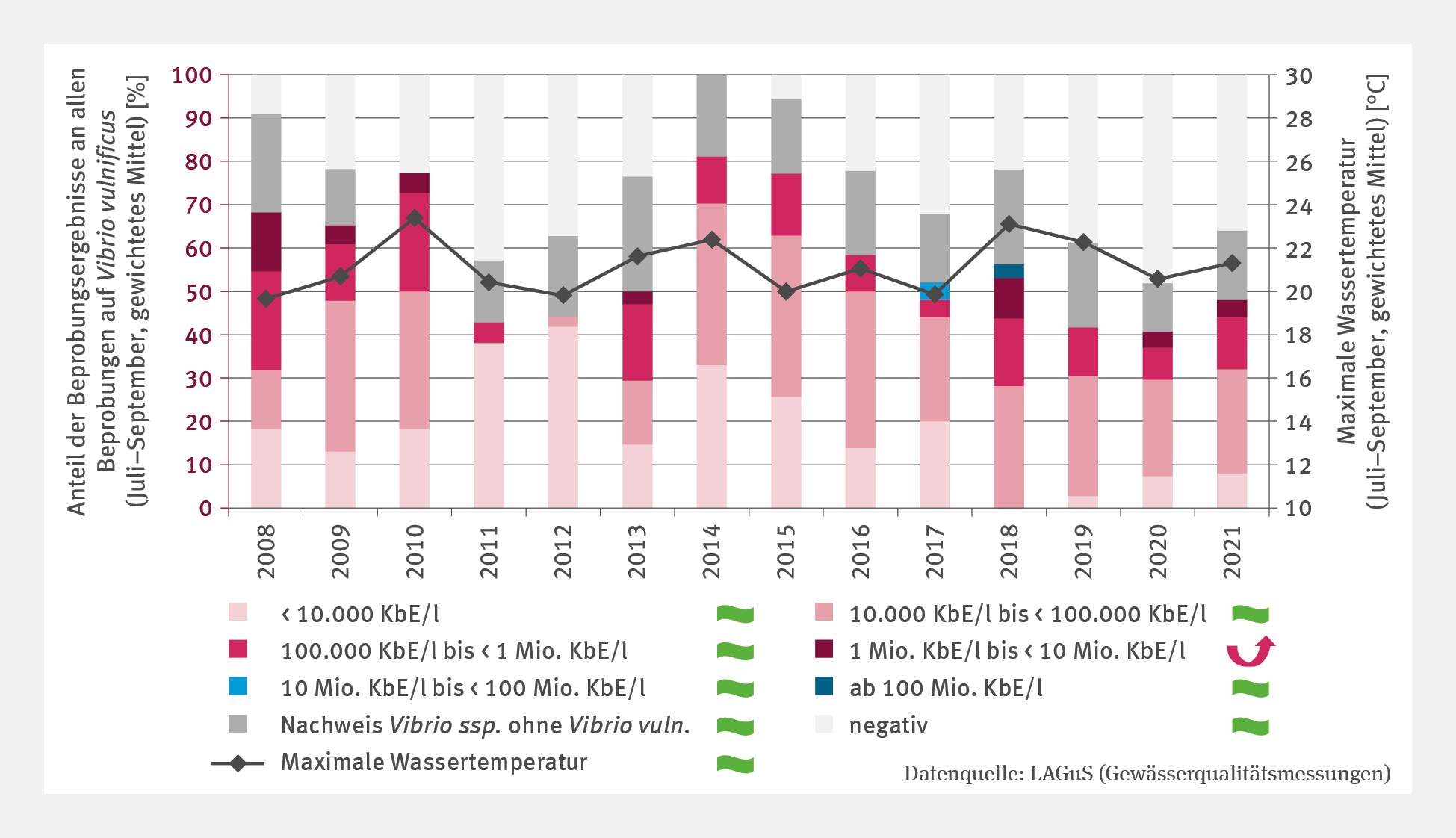 Steigen die Temperaturen bereits früh im Jahr schnell an oder sind sie im Jahresverlauf besonders hoch, können die Bakterien früher und in höheren Konzentrationen nachgewiesen werden. So erbrachten im Jahr 2010 infolge einer sommerlichen Hitzewelle bei außergewöhnlich vielen Sonnenstunden an der Küste Mecklenburg-Vorpommerns rund 77 % aller Proben einen Nachweis von Vibrio vulnificus in der Ostsee. Die Bakterien erreichten zudem Konzentrationen von 1 Mio. bis unter 10 Mio. koloniebildende Einheiten pro Liter (KbE/l). Als koloniebildende Einheit gelten einzelne oder zusammenhängende Mikroorganismen, die nach Vermehrung in einem Nährmedium eine Kolonie bilden. Diese Größe gibt Aufschluss über die Zahl beziehungsweise Konzentration von Bakterien. Der Anteil positiver Proben lag nur 2014 höher, einem ebenfalls außergewöhnlich warmen Jahr. Die höchste bisher ermittelte Konzentration von über 100 Mio. KbE/l wurde im Rekordhitzejahr 2018 festgestellt, als eine stabile Hochdruckbrücke von den Azoren bis in die Barentssee von Mai bis in den August hinein für hohe Wassertemperaturen sorgte.
