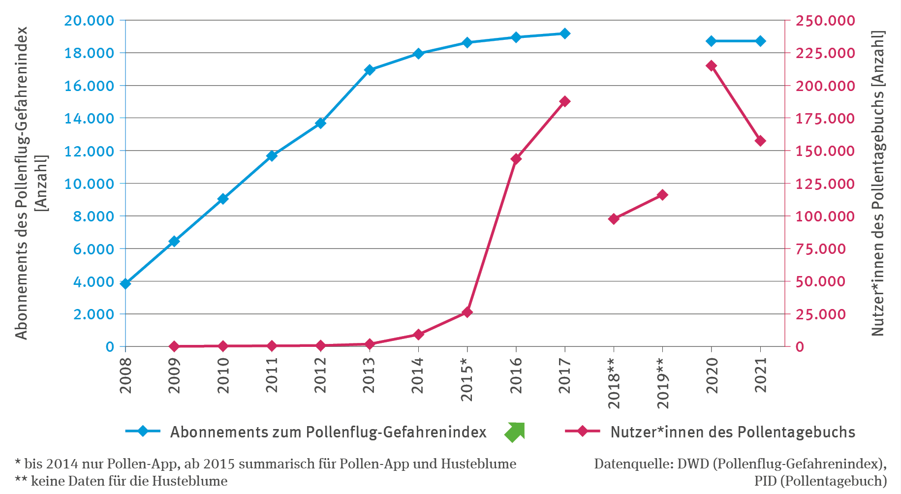 Wie im Falle der Hitzewarnungen (siehe Indikator GE-R-1) stehen für die Jahre 2018 und 2019 aufgrund der damals noch ausstehenden Regelungen im Zusammenhang mit der DSGVO keine Daten zu den DWD Newsletter-Abonnements zur Verfügung. In den Jahren 2020 und 2021 stagnierten die Abonnementzahlen. Vergleichbar der Situation bei den Newslettern mit Hitzewarnungen liegt dies vermutlich an der wachsenden Zahl von App-Nutzungen, die stärker auf das moderne Nutzungsverhalten zugeschnitten sind. In der seit Mai 2020 verfügbaren DWD GesundheitsWetter-App ist der Pollenflug-Gefahrenindex integriert.