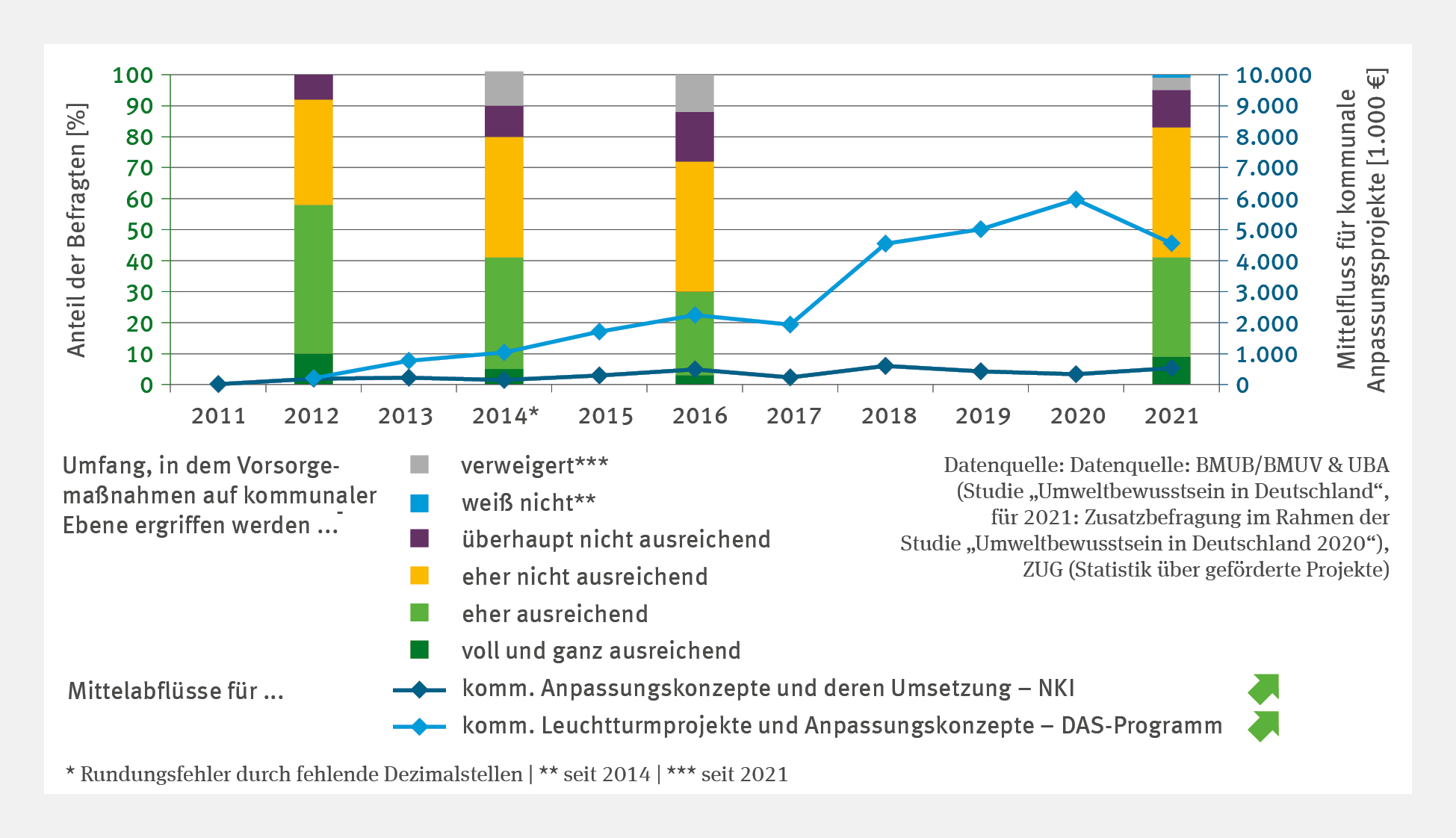 Quelle: BMUB / BMUV & UBA (Umweltbewusstsein in Deutschland 2021); Zusatzbefragung im Rahmen der Studie Umweltbewusstsein für Deutschland 2020; ZUG (Statistik über geförderte Projekte)