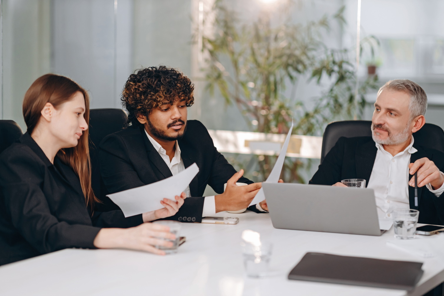 Das Bild zeigt eine Frau und einen Mann an einem Besprechungstisch in einem Büro sitzend. Die beiden förmlich gekleideten Personen halten jeweils ein Dokument in der Hand und tauschen sich aus. Auf dem Besprechungstisch steht ein Glas Wasser, im Hintergrund ist eine Pflanze zu sehen. Der Raum wird durch einstrahlendes Sonnenlicht erhellt.