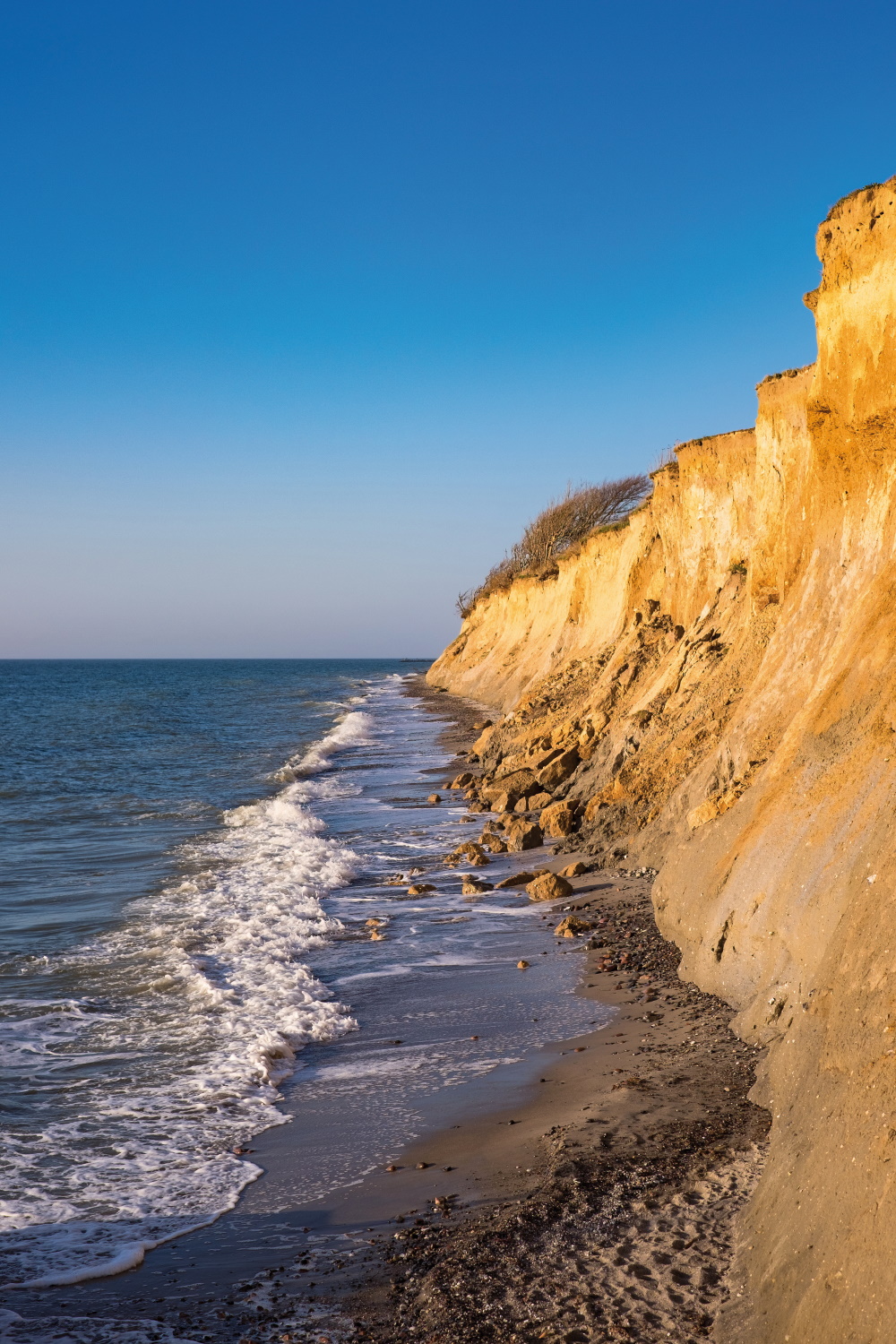 Das Bild zeigt die hellbraune Steilküste bei Ahrenshoop an der Ostsee. Am Fuß des Kliffs ist das Meer und die Gischt einer Welle zu sehen. An einem Küstenabschnitt befindet sich lockeres Material und Gestein, das sich von der Kliffoberkante an den Klifffuß verlagert hat.