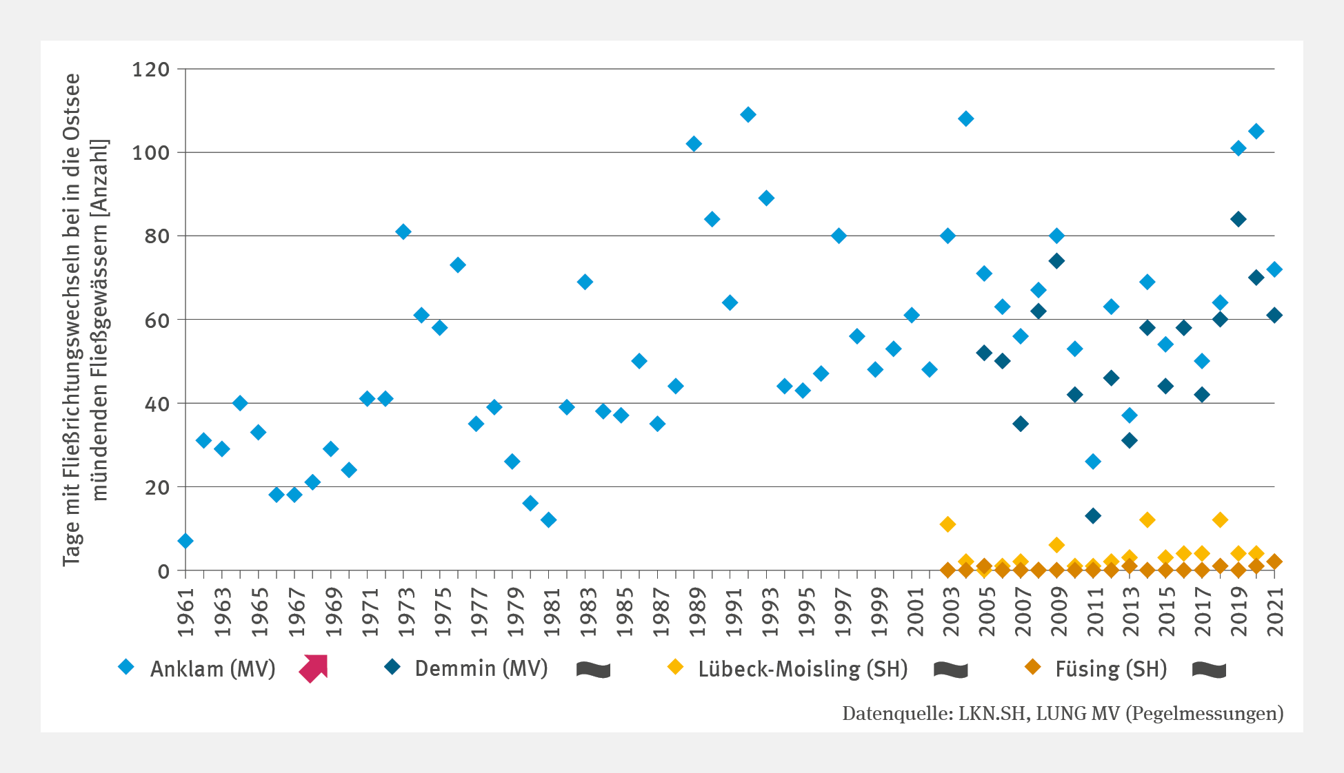 Die Zeitreihen verlaufen aufgrund des Einflusses einzelner Extremereignisse schwankend. Am Pegel Anklam kam es erstmals im hydrologischen Jahr 1989 an über 100 Tagen zu einem Fließrichtungswechsel aufgrund von Rückstau. Vor allem im August des Jahres wurden negative Abflusswerte registriert, als ein schwerer Sturm mit orkanartigen Böen an der Ostseeküste zu Hochwasser mit meterhohen Wellen und erheblichen Schäden führte. Ähnlich häufig kam es zuletzt in den hydrologischen Jahren 2019 und 2020 zu Rückstausituationen am Pegel Anklam. Zu Beginn des Jahres 2019 trugen gleich zwei Sturmfluten kurz hintereinander zu Fließrichtungswechseln in der Peene bei. In diesem Jahr kam es am Pegel Demmin mit Fließrichtungswechseln an 84 Tagen zum bisherigen Höchstwert der Zeitreihe. Die meisten Tage mit Fließrichtungswechsel am Pegel Lübeck-Moisling wurden im September 2014 gemessen: Ende des Monats beeinflusste Sturmtief „Gudrun“ den Ostseeraum. Als der Wind in der westlichen Ostsee an Stärke gewann und auf Nord drehte, erreichte der Wasserstand an der Küste den Monatshöchstwert und drückte Meerwasser in die küstennahen Fließgewässer.