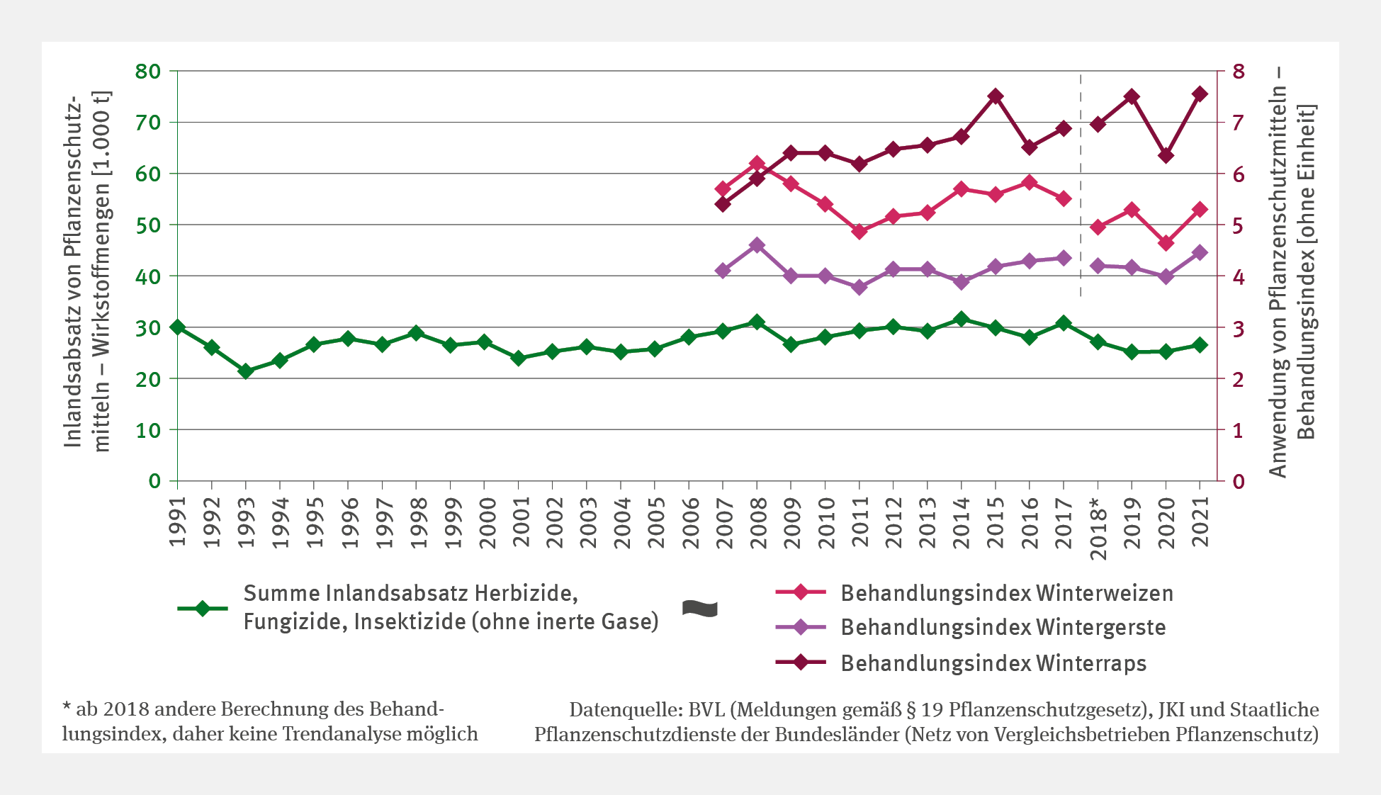 Im Jahr 2018 wurde die Methodik zur Berechnung des Behandlungsindex modifiziert. Der Indikator berechnet nun detaillierter die Intensität der Pflanzenschutzmittelanwendung. Aufgrund dieser Anpassung kommt es zu einem Bruch in der Zeitreihe und es ist derzeit keine Trendanalyse möglich. Trendinterpretationen sind hier allerdings auch grundsätzlich schwierig, weil es neben dem Klima beziehungsweise der jahresspezifischen Witterung vielfältige Einflussfaktoren gibt. Auch hier wären gezielte Analysen nötig, um den Einfluss des Klimawandels quantifizieren zu können.