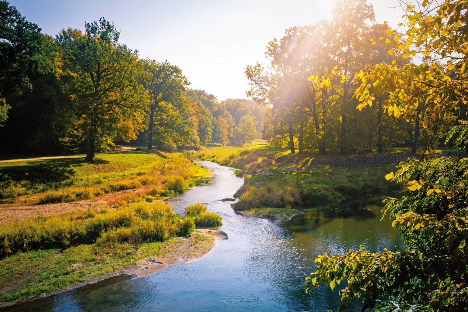 Das Bild zeigt einen Bach, der durch eine Wiese fließt. Bäume und Baumgruppen säumen die Wiese.
