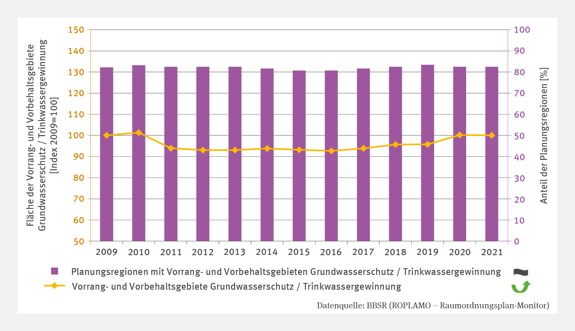 Die Abbildung „Vorrang- und Vorbehaltsgebiete für den Grundwasserschutz/Trinkwassergewinnung“ zeigt die auf 2009 indexierten Flächenwerte von 2009 bis 2021. Die Entwicklung der Flächen zeigt eine Trendumkehr von fallend zu steigend. Zusätzlich zeigt eine Säulenreihe den Anteil der Planungsregionen mit solchen Gebieten, der konstant bei rund 80 % liegt. Ein Trend ist nicht zu erkennen. RO-R-2: Vorrang- und Vorbehaltsgebiete Grundwasserschutz / Trinkwassergewinnung